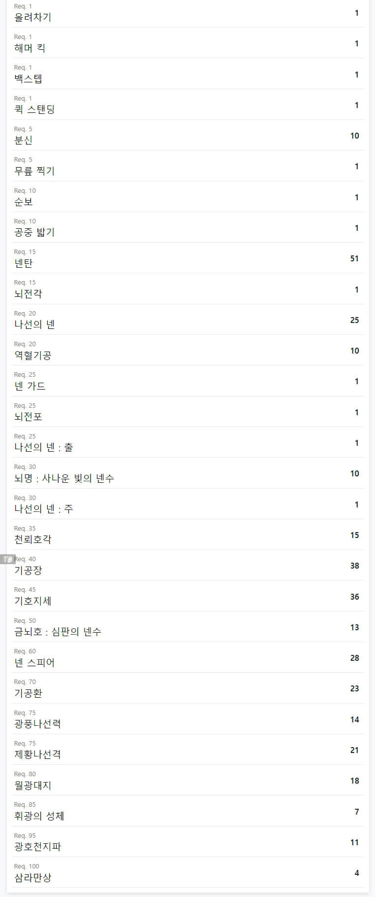 위는 던파 OFF에서 7월 12일 기준으로 랭커 6인의 남넨마스터 스킬트리 액티브입니다. 기본 전직 스킬인 '넨탄'을 6명의 플레이어 모두에게 동일하게 선택되었습니다. 그리고 '분신' 스킬을 보면 5명이 10개를 마스터를 하였고 1인은 1개만 선택되었습니다. 그리고 '뇌전포' 스킬을 선택하는 것과 하지 않는 것의 차이가 있습니다. 나머지 스킬은 플레이어 6명이 거의 동일합니다.