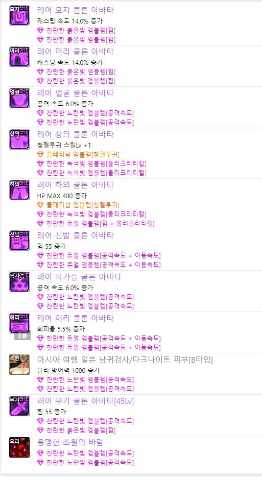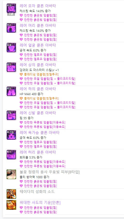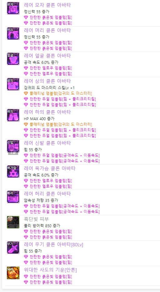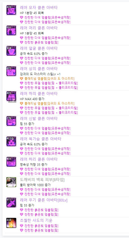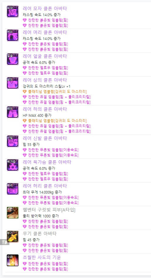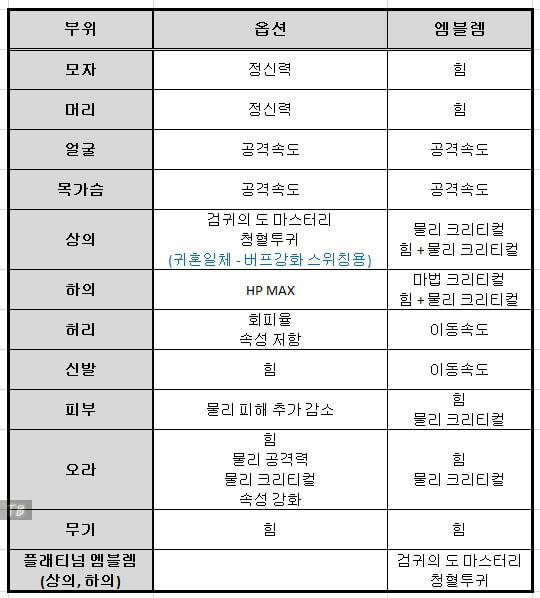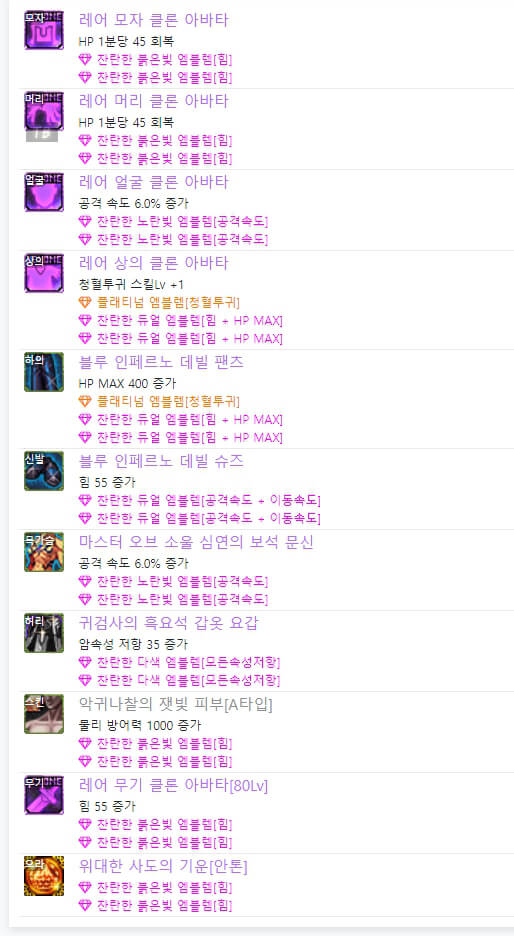 위는 던파 검귀 아바타 정옵입니다. 전반적으로 공격 속도와 힘 및 물리 크리티컬과 많은 관련이 있습니다. 이벤트 아바타를 사용할 시, 위와 같이 엠블렘을 대략적으로 사용할 수 있습니다. 하지만 랭커들을 보면 모두 레어 클론 아바타를 입고 입고 엠블렘도 조금씩 다릅니다.