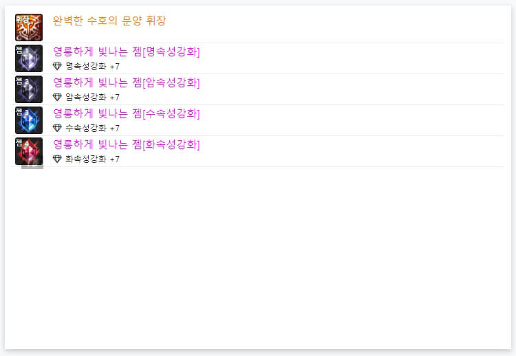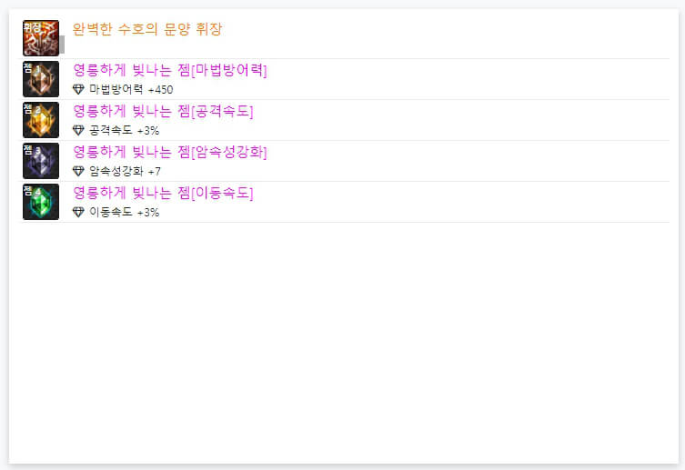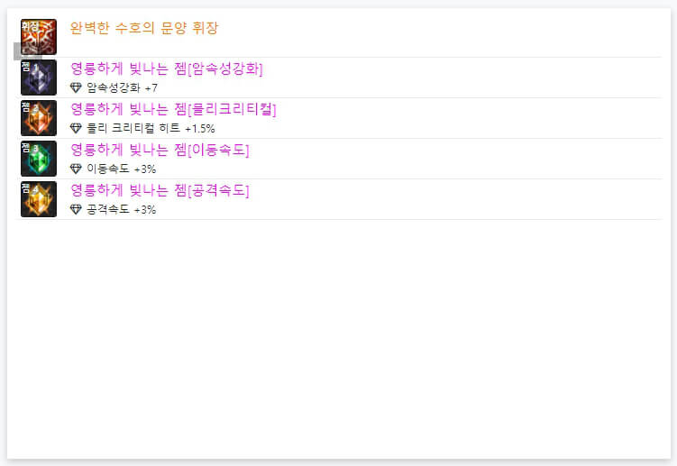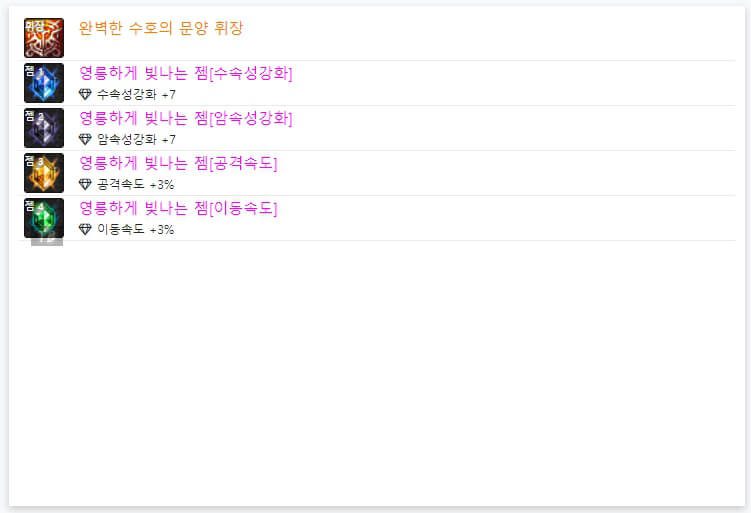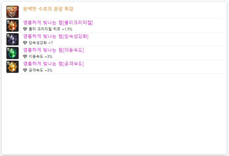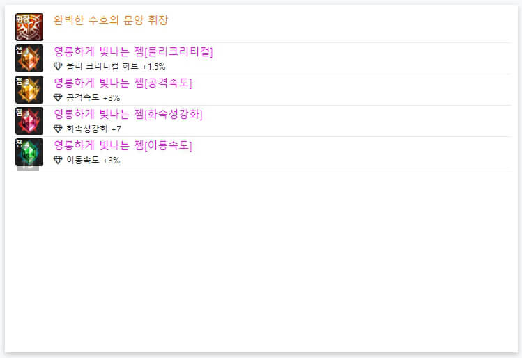 위에서 언급했듯이, 6명 모두 '완벽한 수호의 문양 휘장'을 사용하고 있습니다. 즉, 휘장은 각 직업에 대해, 100% 동일합니다. 이제 휘장 아래에 있는 젬을 확인해보겠습니다. 6명 모두 젬은 다르게 사용하고 있습니다. 휘장과 달리, 젬은 유저마다 다르게 사용합니다. 일반적으로 딜러는 '속성 강화, 공격 속도, 이동속도, 크리티컬'을 많이 사용하는 경향이 있습니다. 다만 위와 같이 4가지 속성 강화를 사용하는 경우가 있으며, 크리티컬 확률이 100% 이상이면 다른 것을 사용해도 무방합니다. 아이템과 스킬 등에 따라 젬을 선택하시면 될 것 같습니다. 지금까지 던파 검귀 악귀나찰 아바타 정옵 및 휘장에 대해 알아보았습니다 긴 글 읽어 주셔서, 감사합니다.
