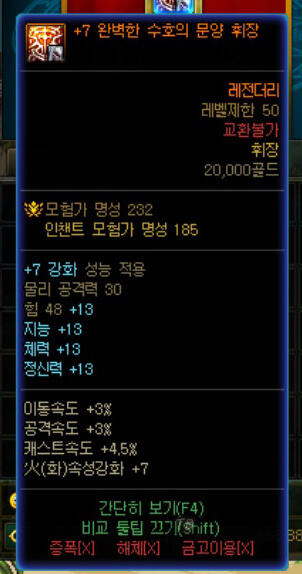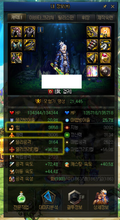 위는 저의 검귀 '내 정보(M)' 창과 휘장입니다. 휘장은 각 직업마다 동일합니다. 즉, 처음 선택할 때, 길드 주화를 아끼기 위해, 올바른 휘장을 선택해야 합니다. 휘장은 '내 정보(M)' 창을 통해, 확인할 수 있습니다. '내 정보(M)' 창을 보면 '힘, 물리 공격, 물리 크리티컬'이 밝게 켜진 것을 확인할 수 있습니다. 즉, 검귀는 힘, 물리 공격, 물리 크리티컬과 관련된 직업이라고 볼 수 있습니다. 따라서 휘장을 '힘 48, 물리 공격력 30'을 높여주는 '완벽한 수호의 문양 휘장'을 선택할 수 있습니다. 그리고 위와 같이 휘장도 아이템처럼 강화를 할 수 있습니다. 직업별 휘장 선택과 강화 방법이 더 궁금하시다면 아래 사진을 클릭하여 확인해보세요.
