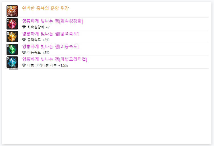 위는 랭커 6인의 던파 남넨마스터 염황 휘장 및 젬 모습입니다. 6명의 플레이어 모두 '완벽한 축복의 문양 휘장'을 사용하고 있습니다. 그리고 밑에 보면 보석처럼 보이는 것을 젬이라고 합니다. 젬은 4가지를 선택할 수 있습니다. 6명의 플레이어 모두 4개의 젬에 대해 '공격 속도, 이동속도, 마법 크리티컬, 속성 강화'를 선택했습니다. 휘장과 젬은 거의 다 통일되어 있어서, 고민하지 않고 선택하시면 될 거 같습니다. 지금까지 던파 남넨마스터 염황 아바타 정옵 및 휘장에 대해 알아보았습니다. 읽어봐 주셔서, 감사합니다.