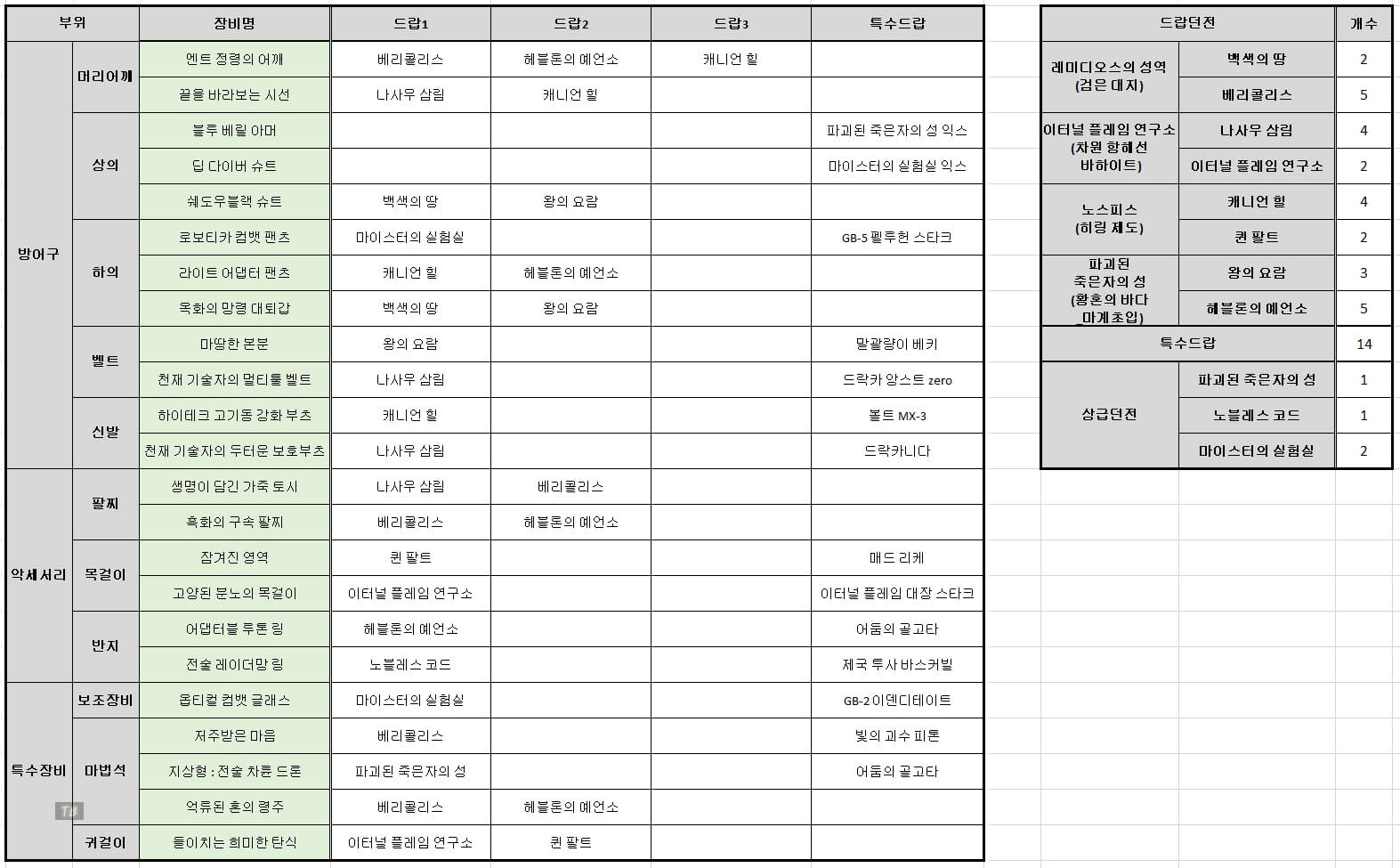위의 표는 랭커 6명이 사용하는 모든 장비 아이템을 정리한 표입니다. 105제 아이템은 모든 던전에서 나오는 것이 아니라 위에 표와 같이 아이템마다 던전이 다릅니다. 따라서 원하는 아이템을 확인 후, 던전을 입장하면 될 거 같습니다. 오른쪽 표를 보면 아이템이 많이 나오는 던전부터 하면 될 것 같습니다. '베리콜리스', '헤블론의 예언소' 던전에서 5개씩 나오므로 먼저 우선적으로 공략해야 할 것 같습니다.