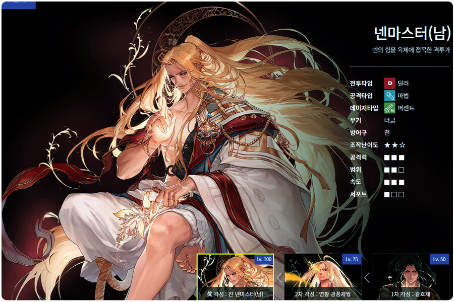 먼저 던파 넨마스터(남) 염황에 대해 간단히 이야기 해보겠습니다. 넨마스터(남) 염황은 넨마스터, 스트라이커, 스트리트파이터, 그래플러로 구성된 격투가(남) 중 하나입니다. 그리고 각성은 광호제, 염황 광풀제월, 진넨마스터(남) 순서로 구성되어 있습니다. 넨마스터(남) 염황의 공격 유형은 마법 공격이며, 데미지 유형은 퍼센트 공격입니다. 죽, 무기는 제련이 아닌 강화를 통해 공격력을 높일 수 있습니다. 그리고 무기는 너클을 사용하고 방어구는 천을 사용합니다.