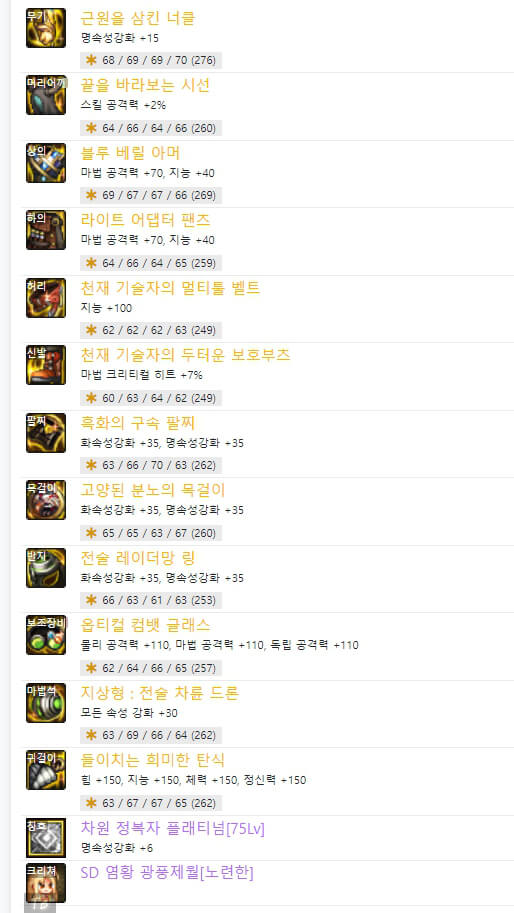 105제 에픽 무기는 위와 같이 두 가지 종류가 있습니다. 하나는 '근원을 삼킨 너클', 다른 하나는 '결전의 너클 - 넨마스터(남)'입니다. 결전 무기는 직업명이 적혀 있어, 자신에게 맞는 직업만 사용가능합니다. 그리고 근원 무기는 너클이면 너클을 사용하는 모든 직업이 가능합니다. 현재는 던파 넨마스터(남)의 무기는 근원 무기가 결전 무기보다 성능이 더 좋은 거 같습니다. 6명의 랭커 모두 근원 무기를 사용하고 있습니다. 이제 칭호 레벨을 보면 6명 플레이어가 모두 75를 선택했습니다. 이제 장비 아이템 중 마법석을 보면 '억류된 혼의 령주'를 랭커 6명 중 1명이 사용하고 있습니다. 사실 여유가 되시면 사용하셔도 되지만 추천하는 아이템은 아닙니다. 그 이유는 크리쳐 개수에 따라 피해 증가 옵션이 있기 때문입니다. 그래서 크리쳐가 많이 필요하기 때문에 많은 비용이 든다고 생각할 수 있습니다. 하의에서도 유사한 아이템이 1개 있습니다. 바로 '옥화의 망령 대퇴갑'입니다. 6명의 랭커 중 1명이 사용하고 있습니다. 이 아이템은 아바타 개수에 따라 피해 증가 옵션이 있으므로 많은 비용이 듭니다. 나머지 아이템들은 중복되는 게 많습니다. 한번 확인해보면 될 거 같습니다.