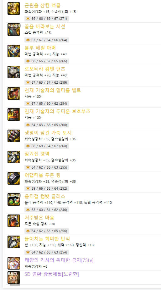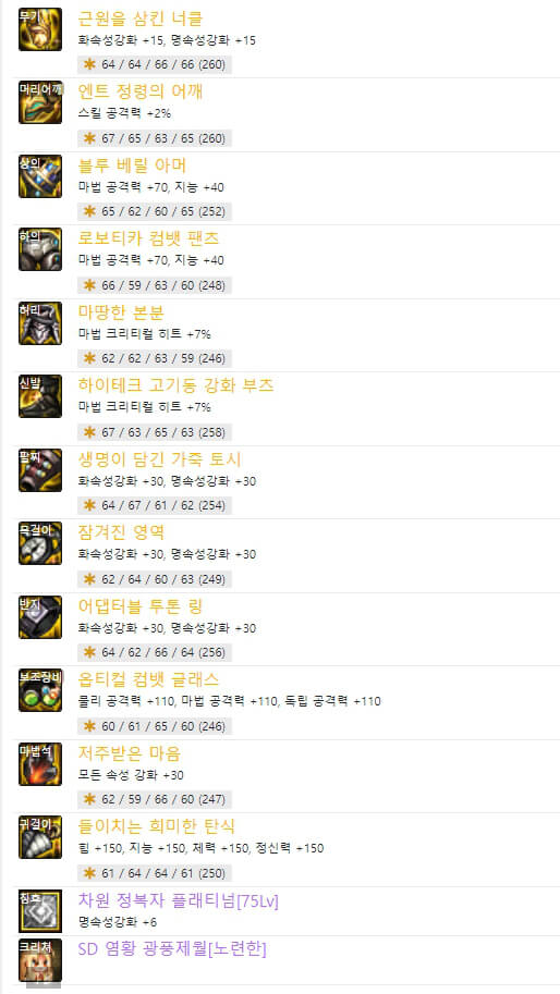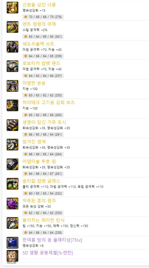105제 에픽 무기는 위와 같이 두 가지 종류가 있습니다. 하나는 '근원을 삼킨 너클', 다른 하나는 '결전의 너클 - 넨마스터(남)'입니다. 결전 무기는 직업명이 적혀 있어, 자신에게 맞는 직업만 사용가능합니다. 그리고 근원 무기는 너클이면 너클을 사용하는 모든 직업이 가능합니다. 현재는 던파 넨마스터(남)의 무기는 근원 무기가 결전 무기보다 성능이 더 좋은 거 같습니다. 6명의 랭커 모두 근원 무기를 사용하고 있습니다. 이제 칭호 레벨을 보면 6명 플레이어가 모두 75를 선택했습니다. 이제 장비 아이템 중 마법석을 보면 '억류된 혼의 령주'를 랭커 6명 중 1명이 사용하고 있습니다. 사실 여유가 되시면 사용하셔도 되지만 추천하는 아이템은 아닙니다. 그 이유는 크리쳐 개수에 따라 피해 증가 옵션이 있기 때문입니다. 그래서 크리쳐가 많이 필요하기 때문에 많은 비용이 든다고 생각할 수 있습니다. 하의에서도 유사한 아이템이 1개 있습니다. 바로 '옥화의 망령 대퇴갑'입니다. 6명의 랭커 중 1명이 사용하고 있습니다. 이 아이템은 아바타 개수에 따라 피해 증가 옵션이 있으므로 많은 비용이 듭니다. 나머지 아이템들은 중복되는 게 많습니다. 한번 확인해보면 될 거 같습니다.