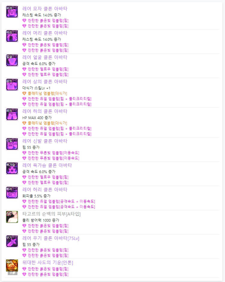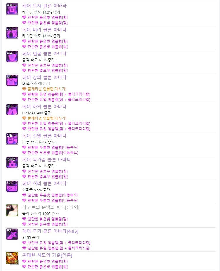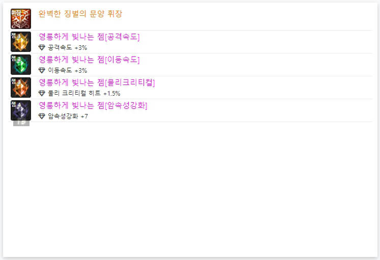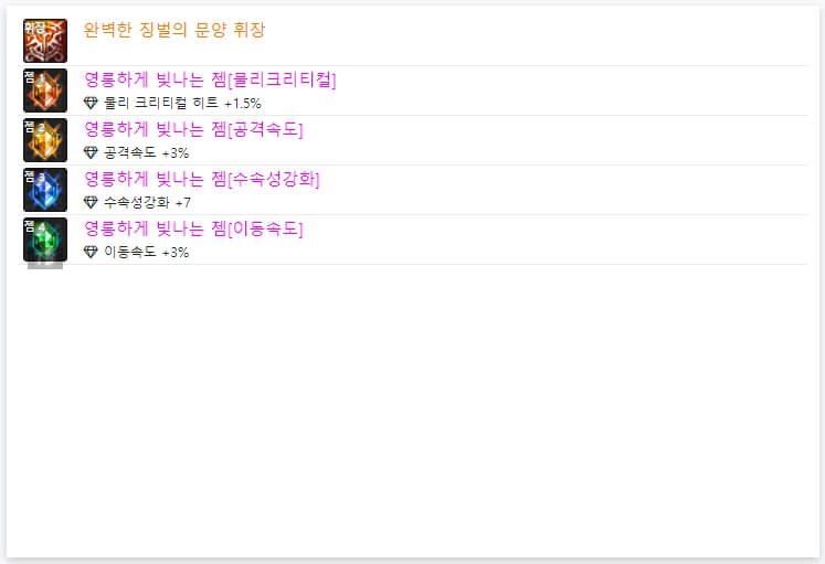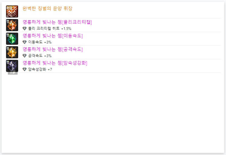 위 모습은 던파 OFF에서 7월 3일 기준으로 6명의 랭커들의 휘장입니다. 휘장은 앞서 언급한 바와 같이 '완벽한 징벌의 문양 휘장'으로 통일되어 있습니다. 그리고 휘장 한 개당 4개의 '젬'을 선택할 수 있습니다. 젬도 마찬가지로 길드 주화로 젬을 구매할 수 있습니다. 6인 랭커 젬을 보면 '이동속도, 공격 속도, 물리 크리티컬, 속성 강화'로 통일되어 있습니다. 같은 젬을 선택하셔도 될 것 같습니다. 지금까지 던파 드래곤나이트 아바타 정옵 및 휘장에 대해 알아봤습니다. 다음 시간에는 던파 드래곤나이트 스킬트리와 탈리스만에 대해 알아보도록 하겠습니다. 읽어봐 주셔서, 감사합니다.