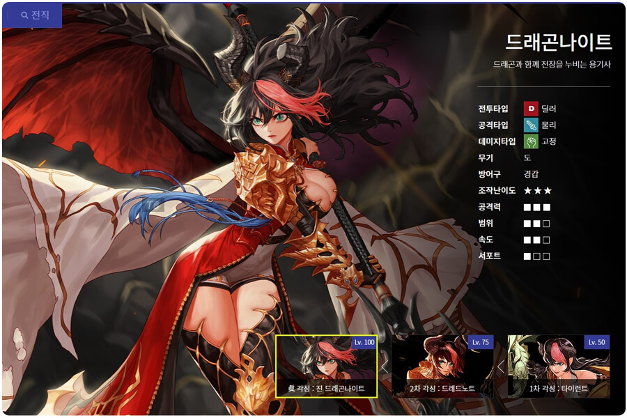 던파 드래곤나이트는 나이트 직업군에 있습니다. 나이트 직업군에는 카오스, 팔라딘, 엘븐나이트, 드래곤나이트가 있습니다. 드래곤나이트는 1차 각성 : 타이런트, 2차 각성 : 드레드노트, 진 각성 : 진 드래곤나이트로 구성되어 있습니다. 직업 이름처럼 드래곤과 관련된 스킬이 많습니다. 공격 유형은 물리 공격이며 피해 유형은 고정입니다. 즉, 독립 공격형이기 때문에, 무기를 강화하지 않고 제련하여 공격력을 높일 수 있습니다. 주 무기는 도를 사용하고 방어구는 경갑을 사용합니다. 블레이드와 마찬가지로 서포트의 역할은 거의 전무하고, 순수 딜러라고 생각하시면 됩니다. 조작 난이도가 별 3개로 되어 있지만 많이 플레이 하다 보니 난이도는 3까지는 아닌 거 같습니다.