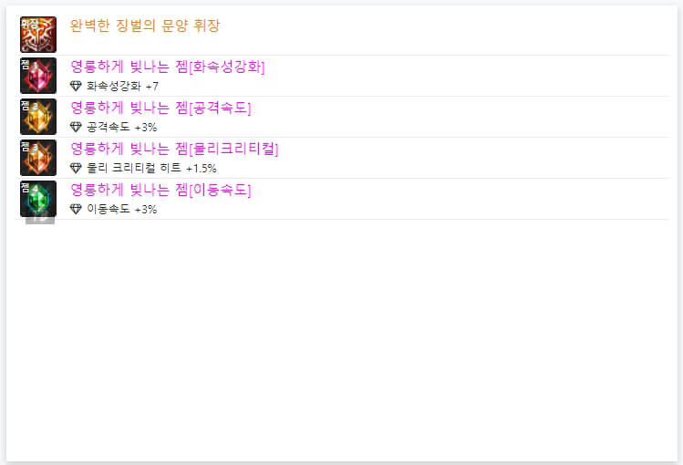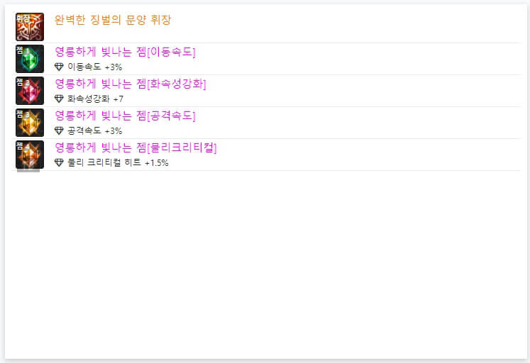 위 모습은 던파 OFF에서 7월 3일 기준으로 6명의 랭커들의 휘장입니다. 휘장은 앞서 언급한 바와 같이 '완벽한 징벌의 문양 휘장'으로 통일되어 있습니다. 그리고 휘장 한 개당 4개의 '젬'을 선택할 수 있습니다. 젬도 마찬가지로 길드 주화로 젬을 구매할 수 있습니다. 6인 랭커 젬을 보면 '이동속도, 공격 속도, 물리 크리티컬, 속성 강화'로 통일되어 있습니다. 같은 젬을 선택하셔도 될 것 같습니다. 지금까지 던파 드래곤나이트 아바타 정옵 및 휘장에 대해 알아봤습니다. 다음 시간에는 던파 드래곤나이트 스킬트리와 탈리스만에 대해 알아보도록 하겠습니다. 읽어봐 주셔서, 감사합니다.