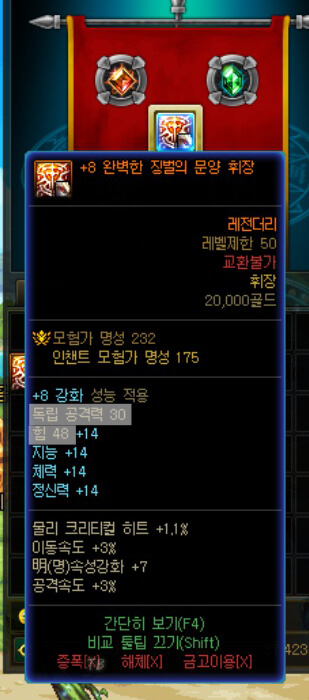 던파에는 휘장이라는 시스템이 있습니다. 휘장은 공격력을 높이는 한 가지 방법입니다. 휘장은 길드 가입을 한 후에, '길드 주화'를 통해 구입할 수 있습니다. 여기서 중요한 점은 아무거나 사면 안된다는 것입니다. 물리 공격, 마법공격, 독립 공격, 힘, 지능에 따라 휘장을 구매해야 합니다. 위는 저의 드래곤나이트 정보창입니다. 게임 내 단축키 'M'을 눌렀을 때 나타나는 화면입니다. 휘장을 구매 전에 캐릭터 정보창에서 확인이 필요합니다. 위를 보면 '힘, 물리 크리티컬, 독립 공격'이 밝게 켜진 것을 확인할 수 있습니다. 이것이 확인되면 휘장을 선택할 수 있습니다. 드래곤나이트는 독립 공격력 30, 힘 48의 '완벽한 징벌의 문양 휘장'을 선택할 수 있습니다. 확실하지 않은 경우 '완벽한 징벌의 문양 휘장'을 찾아 선택하시면 됩니다. 위 그림과 같이 휘장도 장비 아이템처럼 강화를 할 수 있습니다.