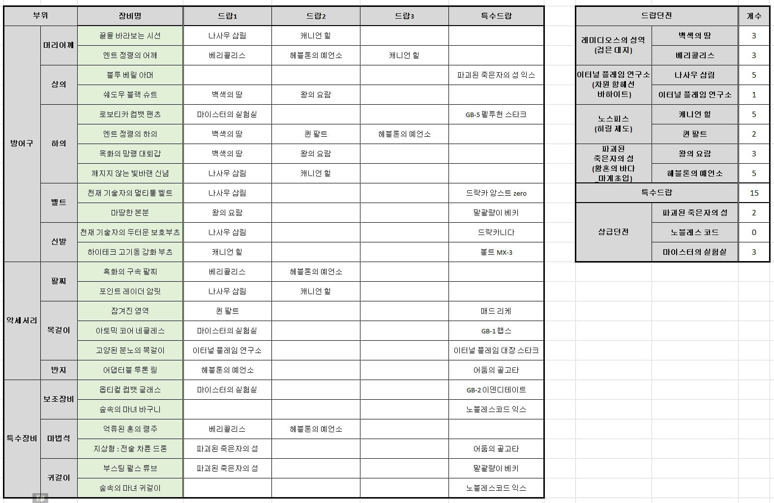 드래곤나이트 에픽 105제 장비 아이템 던전의 위치입니다. 아이템마다 등장하는 던전의 위치가 다르기 때문에 필요한 아이템을 확인하신 후 입장하시면 좋을 거 같습니다. 전체적으로 보면 나사우 삼림과 캐니언 힐, 헤블론의 예언소에서 5개씩 가장 많이 나오므로 이 던전을 우선시해야 합니다.