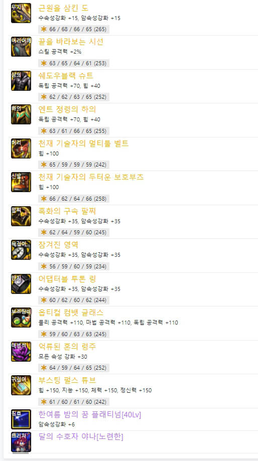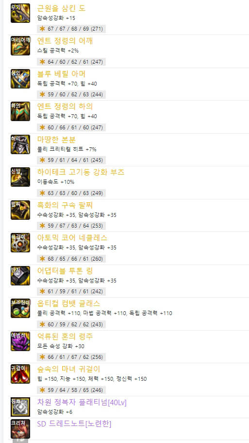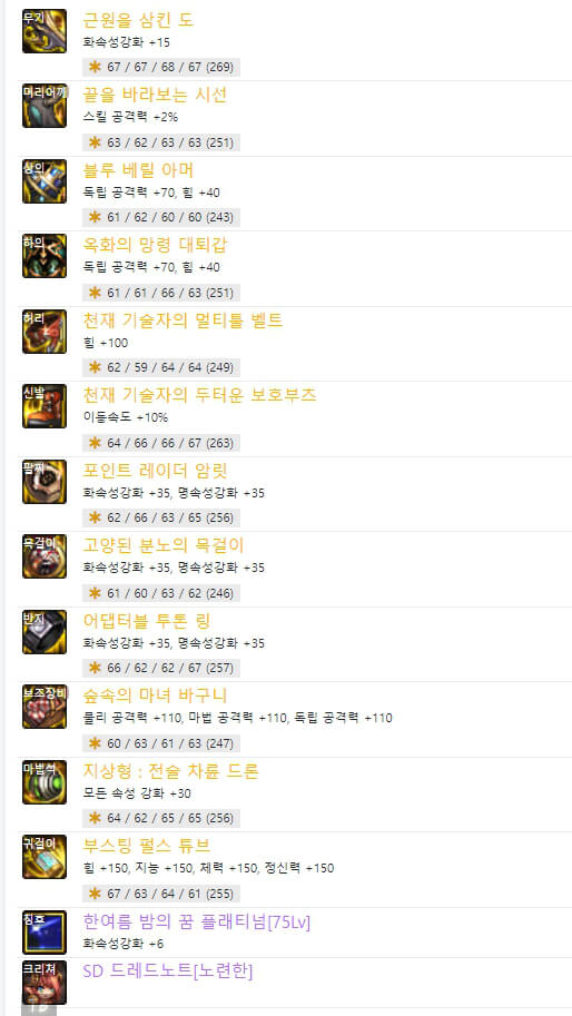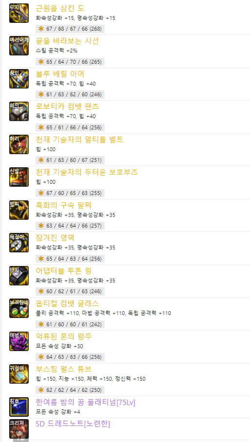 위와 같이 직업별로 '결전의 도 - 드래곤나이트'와 '근원을 삼킨 도'의 2종류의 무기가 있습니다. 하나는 직업명이 붙은 결전 무기이고 다른 하나는 근원 무기입니다. 결전 무기는 자기 직업만 사용할 수 있으며, 근원을 삼킨 도는 도를 사용하는 직업이라면 누구나 사용할 수 있습니다. 현재로서는 근원 무기가 결전 무기보다 성능이 더 좋은 거 같습니다. 6명의 랭커가 모두 '근원을 삼킨 도'를 사용하고 있습니다. 이제 장비 아이템 중에 마법석을 보면 6명 중 5명이 '억류된 혼의 령주'를 사용하고 있습니다. 하지만 별로 추천하지 않습니다. '억류된 혼의 령주'는 보유하고 있는 크리쳐 수에 따라서 피해 증가시키는 옵션이 있습니다. 따라서 크리쳐가 많이 필요합니다. 사실 돈이 많으면 추천하지만 저와 같은 평범한 사람이라면 다른 아이템을 선택하는 것이 좋을 것 같습니다. 그리고 하의에도 비슷한 아이템이 있습니다. '옥화의 망령 대퇴갑'입니다. 6명의 랭커 중 1명만 사용하고 있습니다. '옥화의 망령 대퇴갑'은 아바타 개수에 따라 피해 증가 옵션이 있습니다. 그래서 추천하지 않습니다. 다행히 하의에서는 다른 대체 장비 아이템이 많이 있는 것 같습니다. 칭호의 스킬 레벨은 40제 3명, 75제 3명으로 반반으로 선택했습니다. 칭호의 레벨 선택 기준은 탈리스만 룬에서 '태도 용제무쌍-40제'을 선택하느냐, '미디어 버스트-75제'를 선택하느냐에 따라 칭호 레벨을 선택할 수 있습니다. 사실 랭커들과 똑같이 하려면 시간이 많이 걸릴 것 같습니다. 그렇기 때문에 일반적으로 105제 아이템 중 아무거나 먼저 착용하고 새로운 던전 모험가 명성 커트라인에 도달하는 것이 중요합니다. 그리고 필요한 장비 아이템으로 하나씩 변경하면 됩니다.