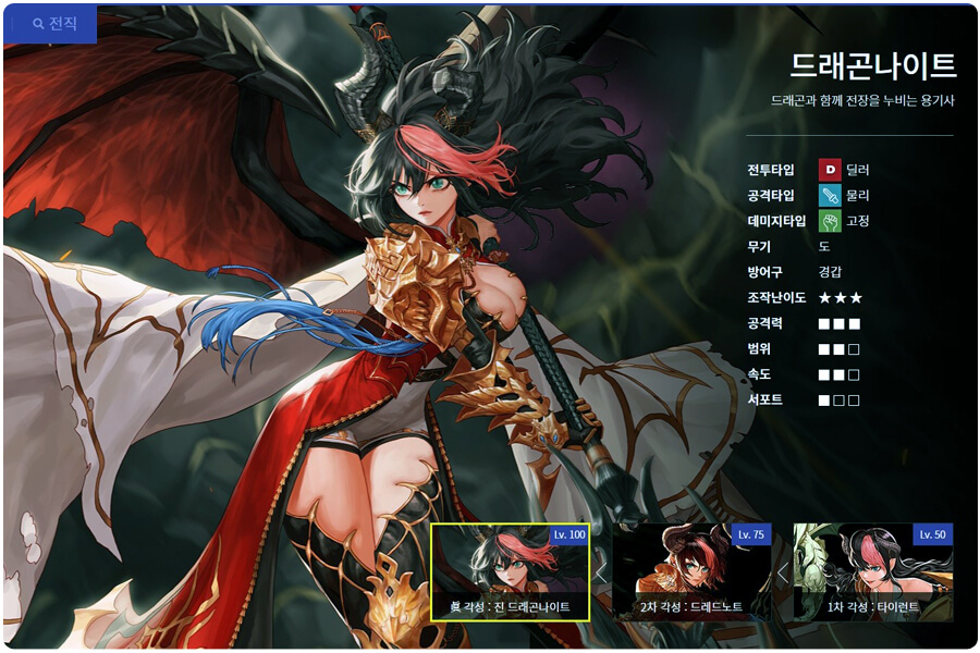 먼저 던파 드래곤나이트를 간략히 살펴보면 나이트 직업 중 하나입니다. 나이트 직업군에서는 카오스, 팔라딘, 엘븐나이트, 드래곤나이트가 있습니다. 공격 유형은 물리 공격과 고정 피해 유형입니다. 고정 피해 유형이기 때문에 독립 공격을 높이면 공격력이 증가합니다. 즉, 무기는 강화를 하지 않고 제련을 하면 됩니다. 드래곤나이트는 서포트 역할은 거의 없으며 순수 딜러로 볼 수 있습니다.