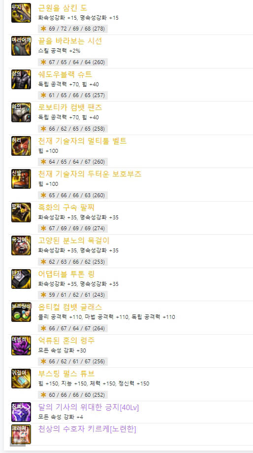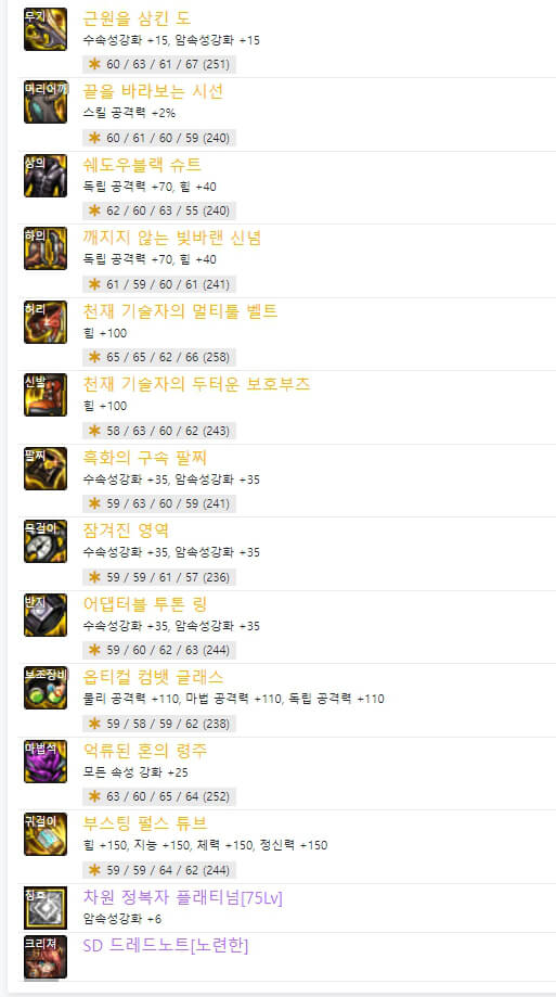 위와 같이 직업별로 '결전의 도 - 드래곤나이트'와 '근원을 삼킨 도'의 2종류의 무기가 있습니다. 하나는 직업명이 붙은 결전 무기이고 다른 하나는 근원 무기입니다. 결전 무기는 자기 직업만 사용할 수 있으며, 근원을 삼킨 도는 도를 사용하는 직업이라면 누구나 사용할 수 있습니다. 현재로서는 근원 무기가 결전 무기보다 성능이 더 좋은 거 같습니다. 6명의 랭커가 모두 '근원을 삼킨 도'를 사용하고 있습니다. 이제 장비 아이템 중에 마법석을 보면 6명 중 5명이 '억류된 혼의 령주'를 사용하고 있습니다. 하지만 별로 추천하지 않습니다. '억류된 혼의 령주'는 보유하고 있는 크리쳐 수에 따라서 피해 증가시키는 옵션이 있습니다. 따라서 크리쳐가 많이 필요합니다. 사실 돈이 많으면 추천하지만 저와 같은 평범한 사람이라면 다른 아이템을 선택하는 것이 좋을 것 같습니다. 그리고 하의에도 비슷한 아이템이 있습니다. '옥화의 망령 대퇴갑'입니다. 6명의 랭커 중 1명만 사용하고 있습니다. '옥화의 망령 대퇴갑'은 아바타 개수에 따라 피해 증가 옵션이 있습니다. 그래서 추천하지 않습니다. 다행히 하의에서는 다른 대체 장비 아이템이 많이 있는 것 같습니다. 칭호의 스킬 레벨은 40제 3명, 75제 3명으로 반반으로 선택했습니다. 칭호의 레벨 선택 기준은 탈리스만 룬에서 '태도 용제무쌍-40제'을 선택하느냐, '미디어 버스트-75제'를 선택하느냐에 따라 칭호 레벨을 선택할 수 있습니다. 사실 랭커들과 똑같이 하려면 시간이 많이 걸릴 것 같습니다. 그렇기 때문에 일반적으로 105제 아이템 중 아무거나 먼저 착용하고 새로운 던전 모험가 명성 커트라인에 도달하는 것이 중요합니다. 그리고 필요한 장비 아이템으로 하나씩 변경하면 됩니다.