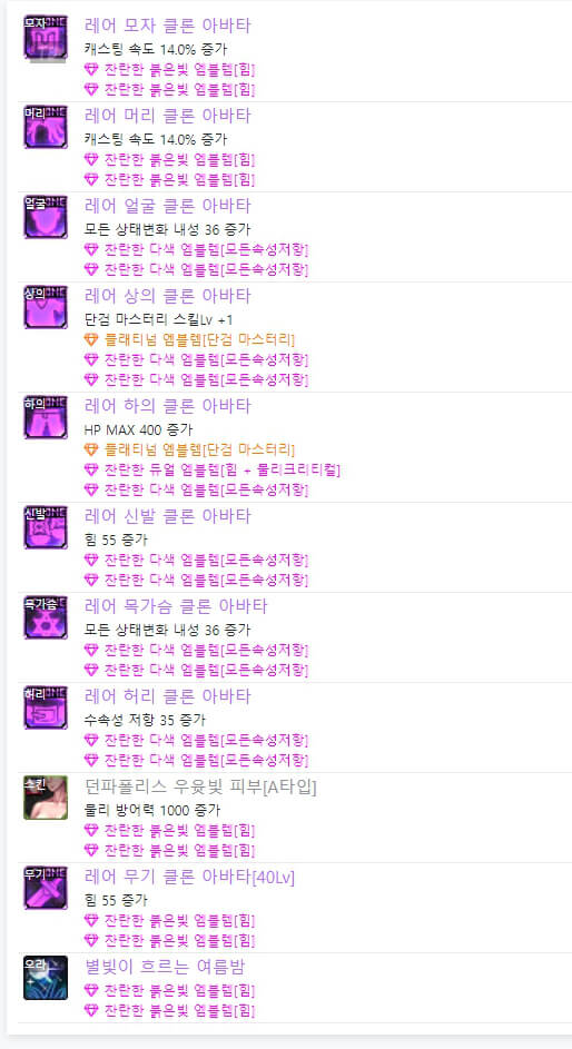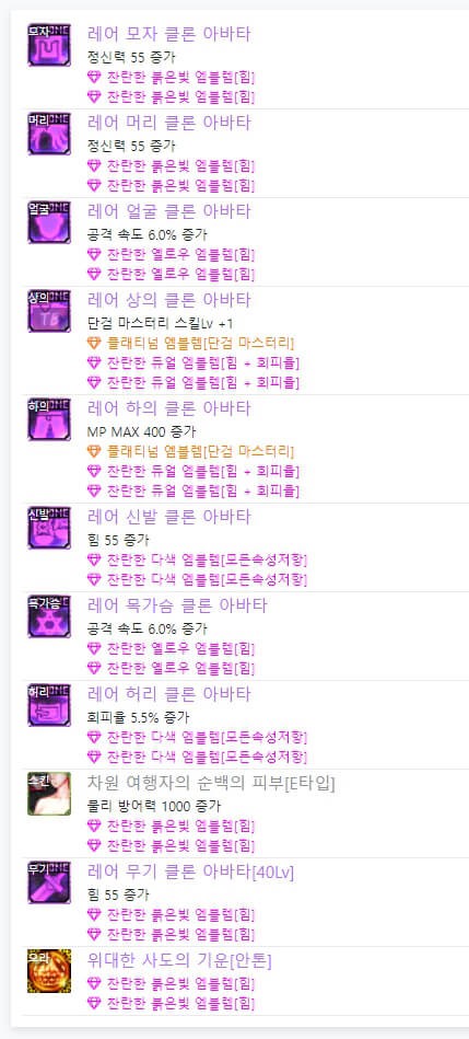 위는 던파 로그 아바타 정옵입니다. 일반적으로 이벤트 아바타를 사용할 때, 위와 같이 많이 투자하지 않는 느낌으로 엠블렘을 사용할 수 있을 것 같습니다. 그러나 보통 랭커는 레어 클론 아바타를 착용합니다. 그리고 엠블렘이 조금 다릅니다.