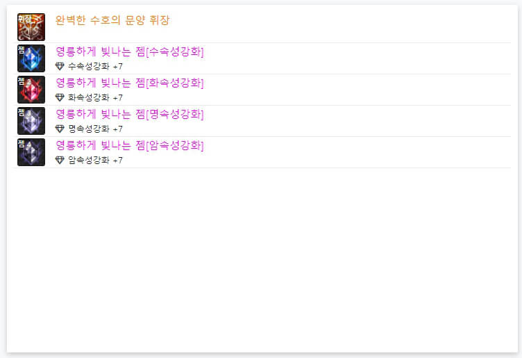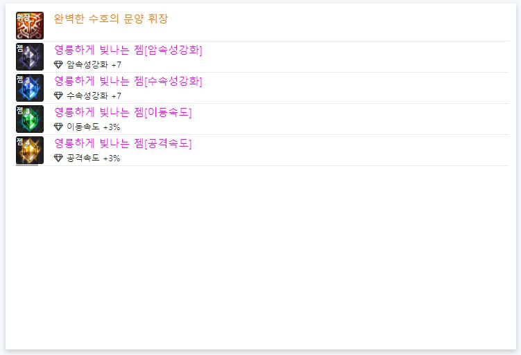 휘장은 직업별로 정해져 있기 때문에, 6명 모두 '완벽한 수호의 문양 휘장'을 사용하고 있는 것을 확인할 수 있습니다. 즉, 휘장은 100% 직업별로 모두 똑같다고 생각하면 됩니다. 그리고 휘장 아래에 보석처럼 생긴 게, '젬'이라고 합니다. 일반적으로 딜러들은 '공격 속도, 이동 속도, 속성 강화, 크리티컬'을 많이 사용하는 경향이 있으며, '캐스트 속도'가 필요한 직업의 경우 한 가지를 바꿔서 사용합니다. 위의 랭커들 보면 공격 속도, 이동 속도와 속성 강화 두 가지를 많이 사용하고 있습니다. 그리고 공격 속도, 이동 속도 없이 4가지 속성 강화를 모두 사용하는 경우도 있습니다. 젬은 100% 꼭 정해져 있는 게 아니라, 위와 같이 상황에 따라 선택하는 것이 적절할 것 같습니다.