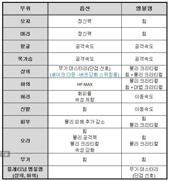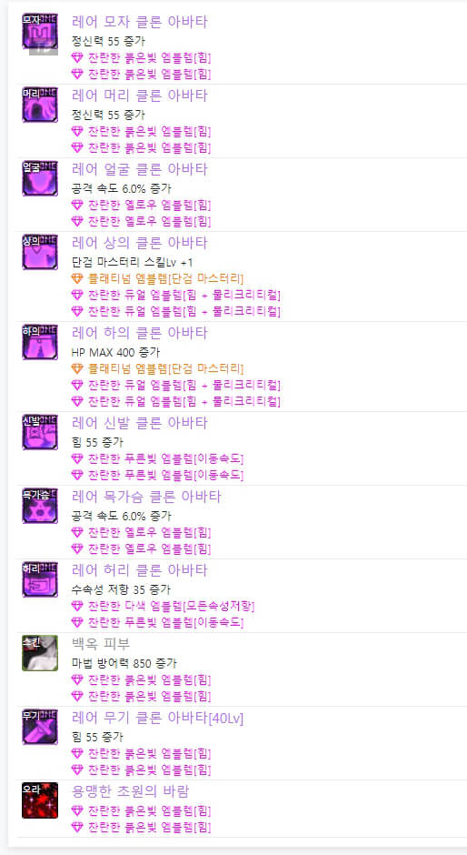 위는 던파 로그 아바타 정옵입니다. 일반적으로 이벤트 아바타를 사용할 때, 위와 같이 많이 투자하지 않는 느낌으로 엠블렘을 사용할 수 있을 것 같습니다. 그러나 보통 랭커는 레어 클론 아바타를 착용합니다. 그리고 엠블렘이 조금 다릅니다.