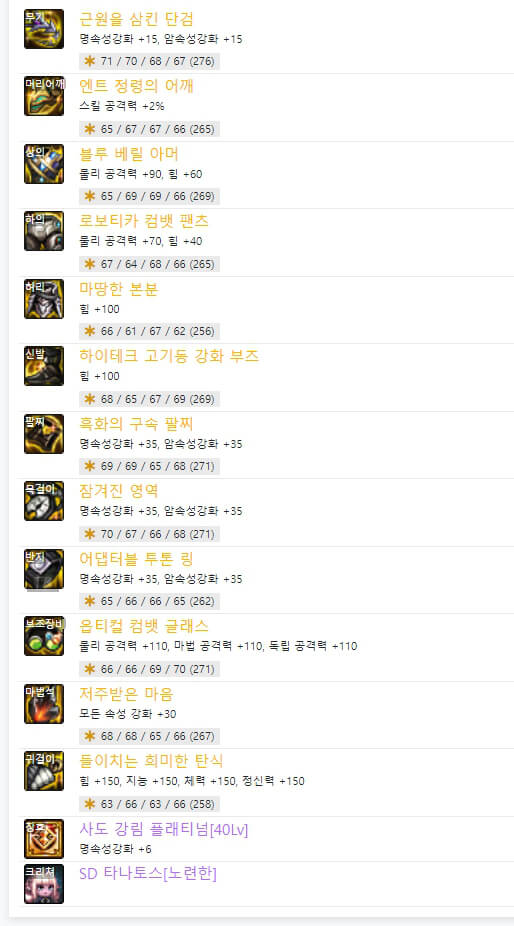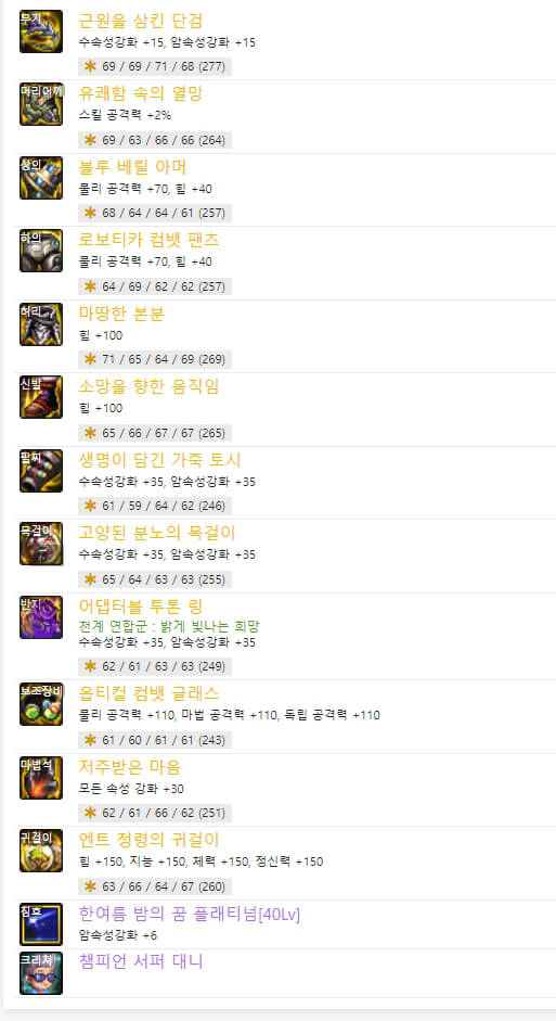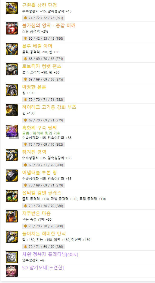 던파 OFF에서 7월 25일 기준으로 던파 로그 알키오네 랭커 6명의 105제 세팅 에픽 장비입니다. 현재 다른 직업도 비슷하지만 딜러 랭커를 보면 대부분 '커스텀' 관련 장비를 사용합니다. '커스텀'과 관련 옵션으로 '엔트 정령 장비'를 사용합니다. 그리고 허리 부위의 '마땅한 본분', 신발 부위의 '하이테크 고기동 강화 부츠'도 커스텀 관련 장비입니다. 그래서 처음부터 랭커들과 똑같이 하기는 어렵습니다. 그리고 이스핀즈 던전이 나온 이후로 이스핀즈 융합된 아이템들도 볼 수 있습니다. 칭호 레벨은 6인 모두 레벨 40을 선택했습니다. 레어 무기 클론 아바타 레벨도 아바타 설명에서 레벨 40을 선택했습니다. 이런 식으로 칭호 레벨과 레어 무기 클론 아바타 레벨을 동일하게 선택하면 됩니다. 던파 로그 아바타 관련 설명이 더 궁금하시다면 아래 사진을 클릭하세요.