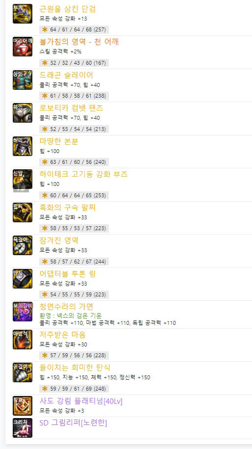 모든 직업에 대해 두 가지 유형의 105제의 에픽 무기가 있습니다. 어떻게 보면 로그는 쌍검, 단검을 모두 사용할 수 있기 때문에 4가지 종류의 무기가 있음을 알 수 있습니다. 위를 보면 '근원을 삼킨 단검'처럼 단검을 사용할 수 있는 직업이라면 모두 사용 가능한 '근원 무기'가 있습니다. 그리고 '결전의 단검 - 로그'와 같이 직업명을 가진 '결전 무기가'가 있습니다. 결전 무기는 직업 이름이 붙어 있으므로 자기 직업만 사용할 수 있습니다. 따로 사진을 가져오지 않았지만 '근원을 삼킨 쌍검'과 '결전의 쌍검 - 로그'도 있습니다. 던파 로그 랭커 6명이 모두 '근원을 삼킨 단검'을 사용하고 있습니다. 그래서 현재는 근원 무기가 더 효율적인 것 같습니다. 이제 다른 부위 105제 장비를 보면 위에서 언급한 것처럼 '커스텀' 관련 장비 아이템들이 많이 있습니다. 하지만 평범한 유저라면 '커스텀' 관련 아이템 이외의 다른 아이템을 권장합니다.