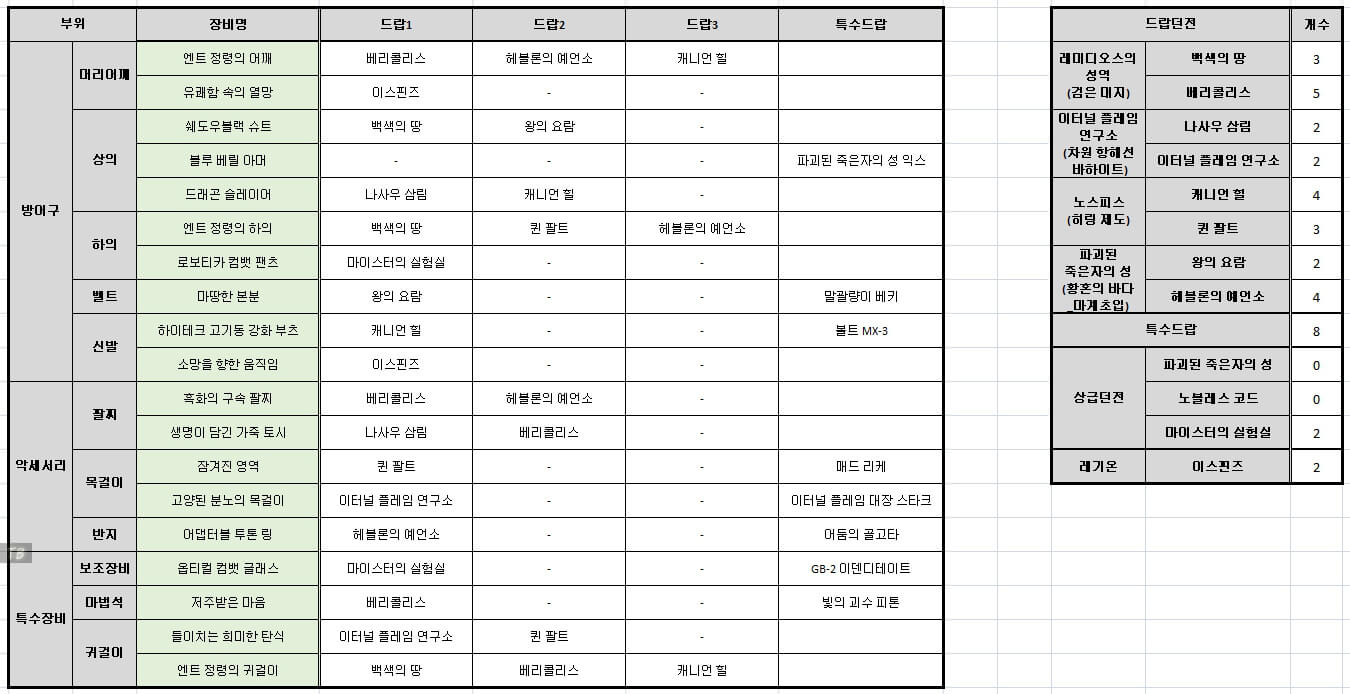 위는 랭커 6명이 사용하고 있는 던파 로그 105제 에픽 장비들이 나오는 던전 위치입니다. 105제 에픽 아이템은 아무 던전이나 랜덤으로 나오는 게 아니라, 위에 표처럼 아이템마다 나오는 던전이 다릅니다. 따라서 필요한 아이템을 확인 후에, 던전을 우선순위를 정하여 순서대로 하시면 좋을 거 같습니다. 오른쪽 표에서 보면 '베리콜리스'에서 5개, '헤블론의 예언소'에서 4개, '캐니언 힐'에서 4개가 나오므로 우선순위로 해서, 먼저 하면 될 거 같습니다.