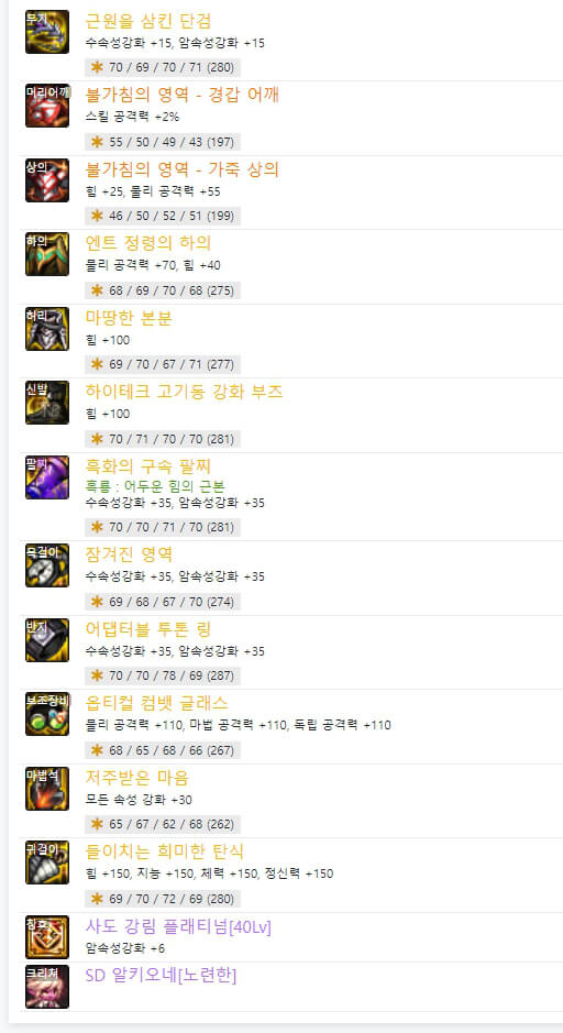 모든 직업에 대해 두 가지 유형의 105제의 에픽 무기가 있습니다. 어떻게 보면 로그는 쌍검, 단검을 모두 사용할 수 있기 때문에 4가지 종류의 무기가 있음을 알 수 있습니다. 위를 보면 '근원을 삼킨 단검'처럼 단검을 사용할 수 있는 직업이라면 모두 사용 가능한 '근원 무기'가 있습니다. 그리고 '결전의 단검 - 로그'와 같이 직업명을 가진 '결전 무기가'가 있습니다. 결전 무기는 직업 이름이 붙어 있으므로 자기 직업만 사용할 수 있습니다. 따로 사진을 가져오지 않았지만 '근원을 삼킨 쌍검'과 '결전의 쌍검 - 로그'도 있습니다. 던파 로그 랭커 6명이 모두 '근원을 삼킨 단검'을 사용하고 있습니다. 그래서 현재는 근원 무기가 더 효율적인 것 같습니다. 이제 다른 부위 105제 장비를 보면 위에서 언급한 것처럼 '커스텀' 관련 장비 아이템들이 많이 있습니다. 하지만 평범한 유저라면 '커스텀' 관련 아이템 이외의 다른 아이템을 권장합니다.