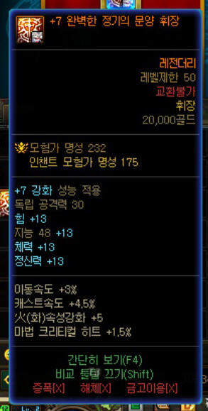 위는 저의 마도학자 '내 정보(M)'창 모습입니다. '내 정보(M)'을 보면 '지능, 마법 크리티컬, 독립 공격'에 밝게 켜진 것을 확인할 수 있습니다. 즉, 마도학자는 이 세 가지와 관련 있는 직업이라고 보면 됩니다. 따라서 휘장도 '독립 공격력 30, 지능 48'을 높여주는 '완벽한 정기의 문양 휘장'을 선택해야 합니다. 휘장은 아무거나 선택하는 것이 아니라 위와 같이 직업에 맞게 선택해야 합니다. 직업별 휘장 선택 방법이 더 궁금하시다면 아래 사진을 클릭하세요.