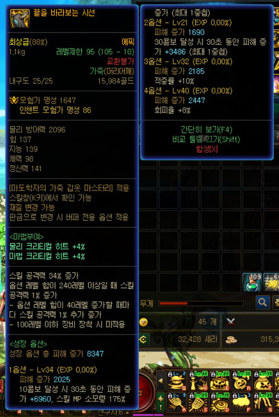 약간의 차이가 있지만 위와 같이 7가지 부위는 거의 중복됩니다. 사실 마도학자뿐만 아니라 다른 딜러 직업들도 귀걸이를 제외하고는 나머지 6가지는 비슷하게 사용하고 있습니다. 귀걸이만 딜러들마다 조금씩 차이가 있었습니다. 여기서 중요한 포인트가 있습니다. 목걸이 부위 '잠겨진 영역'과 마이스터의 실험실에서 등장하는 하의 부위 '로보티카 컴뱃 팬츠'와 보조장비 부위 '옵티컬 컴뱃 글래스' 입니다. 이 아이템에 대한 옵션을 확인해야 합니다. 3가지 아이템의 옵션을 보면 조건이 있습니다. 자세한 사항은 게임 내에서 확인하시면 좋을 것 같습니다. 간단히 말해서 '잠겨진 영역'은 4억 골드의 현금이 필요합니다. 그리고 '로보티카 컴뱃 팬츠'의 경우, 착용한 장비가 증폭이나 강화가 많이 되어야 합니다. 이 숫자의 합에 따라 피해 옵션이 있습니다. 마지막으로 '옵티컬 컴뱃 글래스'는 장비의 평균 등급이 90% 이상이어야 합니다. 3가지 아이템의 조건이 생각보다 어렵습니다. 따라서 옵션을 꼭 확인하고 사용하길 바랍니다. 다음으로 마도학자의 빗자루 무기를 살펴보겠습니다.