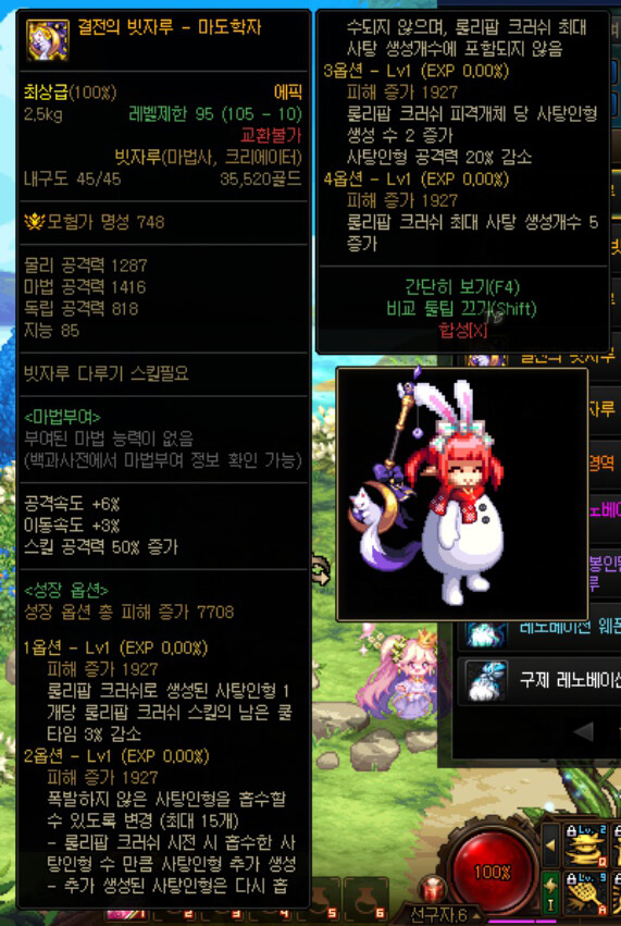 위와 같이 모든 직업은 두 가지 유형의 무기가 있습니다. 직업명을 가지고 있어, 자신의 직업만 사용할 수 있는 결전 무기와 모두 사용 가능한 근원 무기입니다. '결전의 빗자루 - 마도학자'는 마도학자만이 사용할 수 있는 무기입니다. 그리고 '근원을 삼킨 빗자루'는 빗자루를 사용할 수 있는 모든 직업에서 사용할 수 있습니다. 6명의 랭커 중 2명은 '결전 무기'를, 4명은 '근원 무기'를 선택했습니다. '결전의 빗자루 - 마도학자'의 옵션을 보면 '롤리팝 크러쉬' 스킬과 관련된 옵션입니다. 즉, '롤리팝 크러쉬' 스킬 위주로 탈리스만과 룬, 칭호 레벨을 선택하고 싶다면 결전 무기를 사용하면 더 효율적일 것 같습니다.