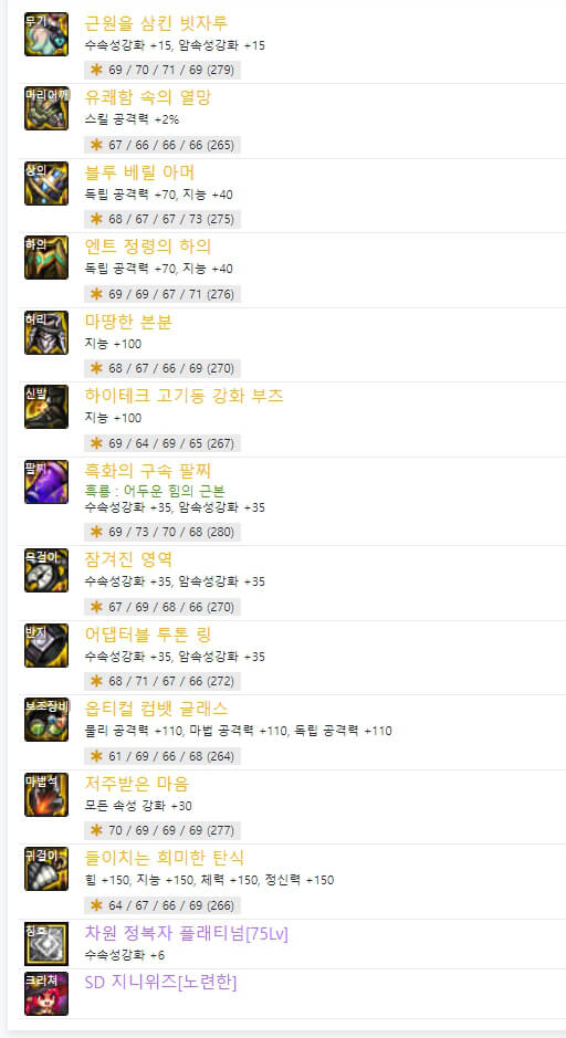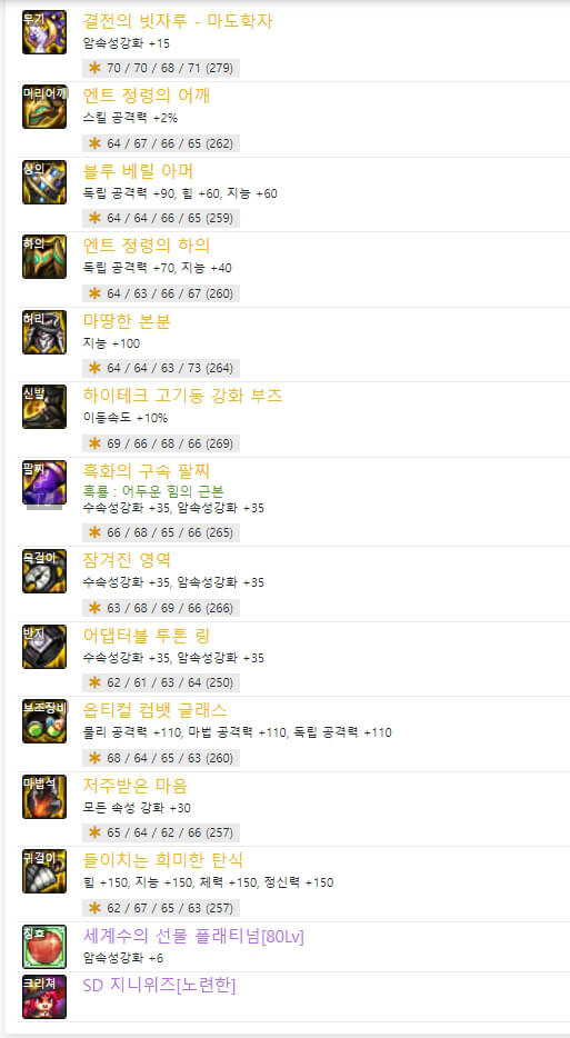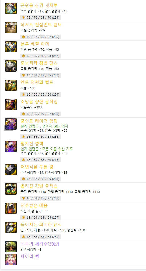 위는 던파 OFF에서 7월 30일 기준으로 6명의 마도학자 랭커 105제 아이템 모습입니다. 요즘 대부분의 딜러들은 '커스텀' 관련 장비를 많이 사용합니다. 커스텀과 관련하여 엔트 정령의 장비 옵션을 선택하여 사용합니다. 또한 벨트 부위 '마땅한 본분', 신발 부위 '하이테크 고기동 강화 부츠'도 마찬가지로 커스텀 관련 아이템입니다. 커스텀 관련 옵션으로 장비를 최대화한 후, 나머지 아이템들은 비슷하게 사용합니다. 거의 중복되는 아이템은 다음과 같습니다.