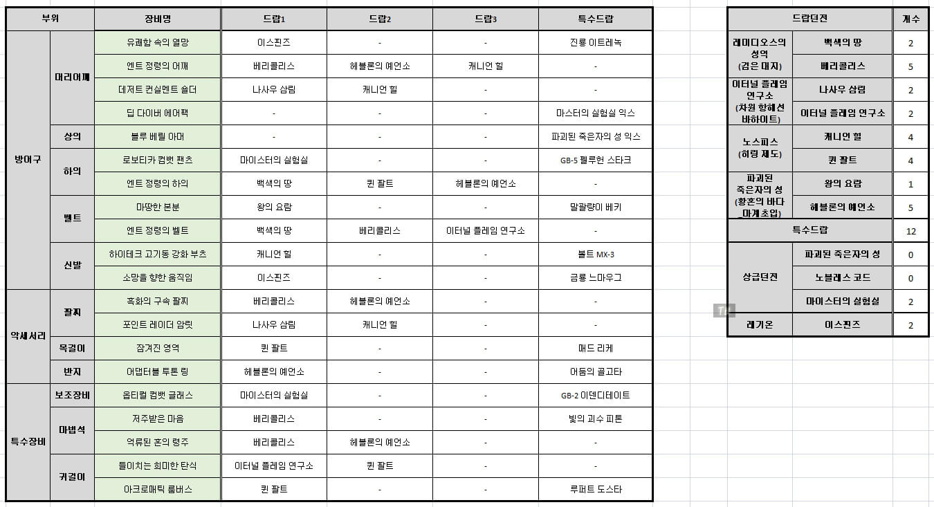 | 부위 | 장비 아이템명 |