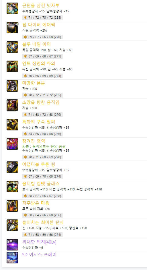 | 부위 | 장비 아이템명 |