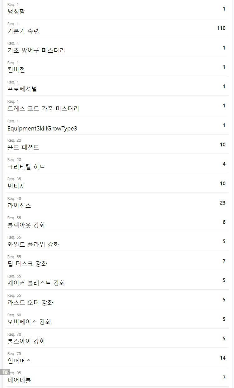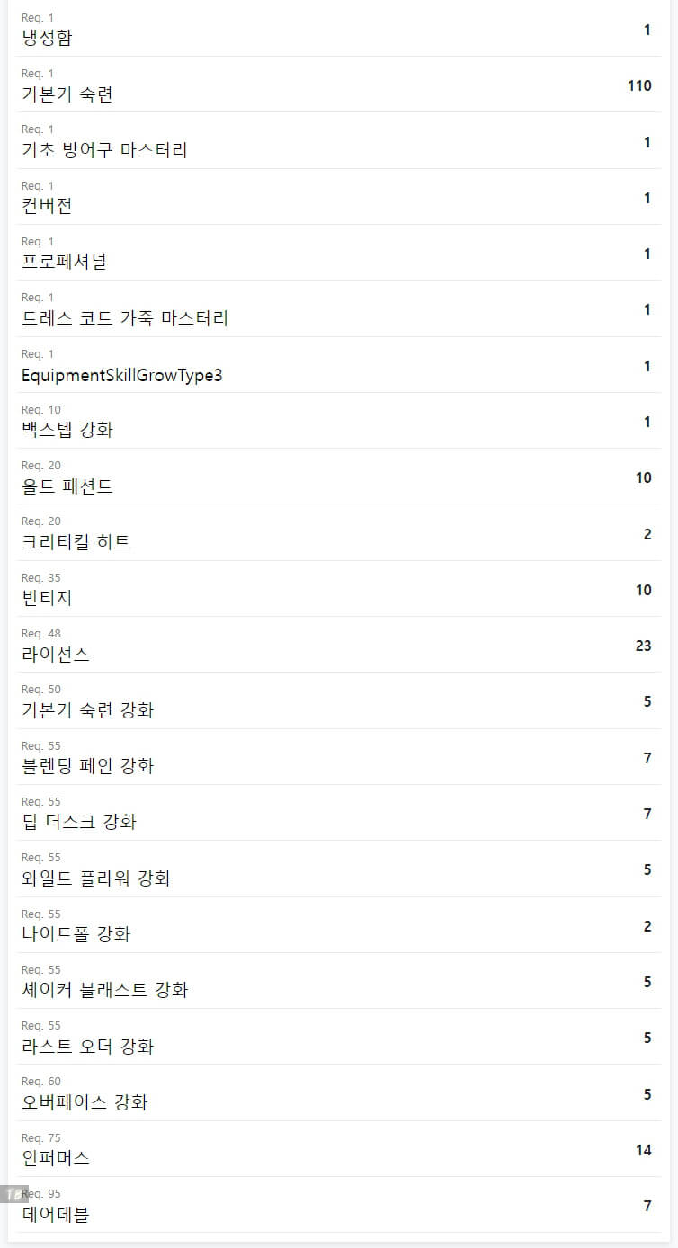 던파 블레이드 스킬트리 패시브 모습입니다. 패시브 스킬은 액티브 스킬을 강화하는 것으로 생각할 수 있습니다. 즉, 액티브 스킬을 먼저 찍고 패시브 스킬을 찍으면 됩니다. 예를 들어, 액티브 스킬에서 불스아이를 1개만 찍었다면 패시브 스킬에서 불스아이 강화를 찍지 않고 다른 강화 스킬에 사용하면 됩니다. 그리고 크리티컬 히트는 10개가 마스터이지만 모두 다릅니다. 크리티컬 히트는 100%가 안 되는 수치만큼만 찍어주면 됩니다. 예를 들어, 모든 장비를 착용한 상태에서 물리 크리티컬이 100% 이상이라면 물리 크리티컬 패시브 스킬에 사용할 필요가 없습니다. 이 경우에는 다른 강화 스킬을 사용하면 됩니다.