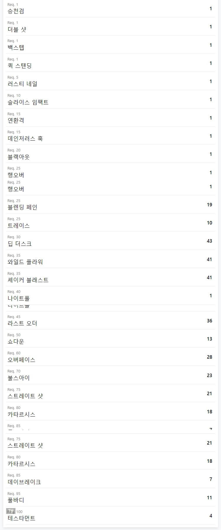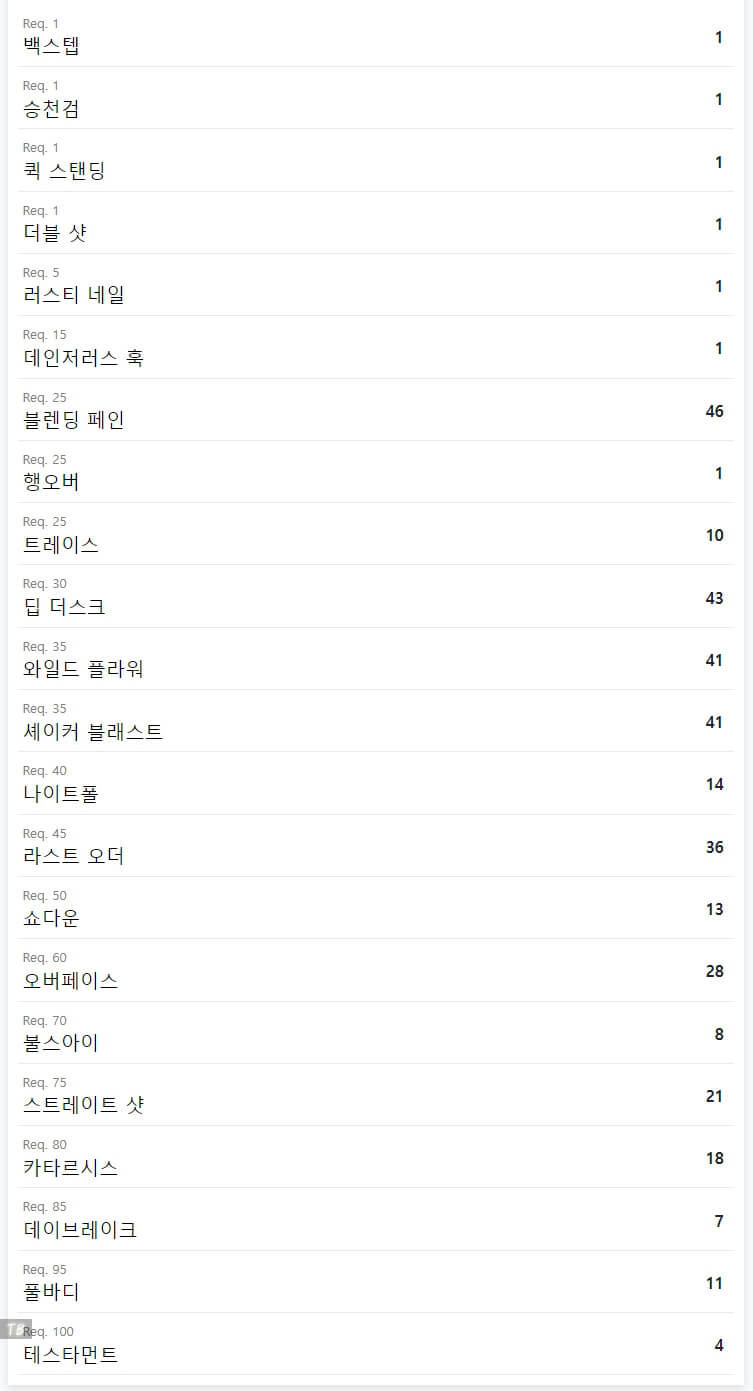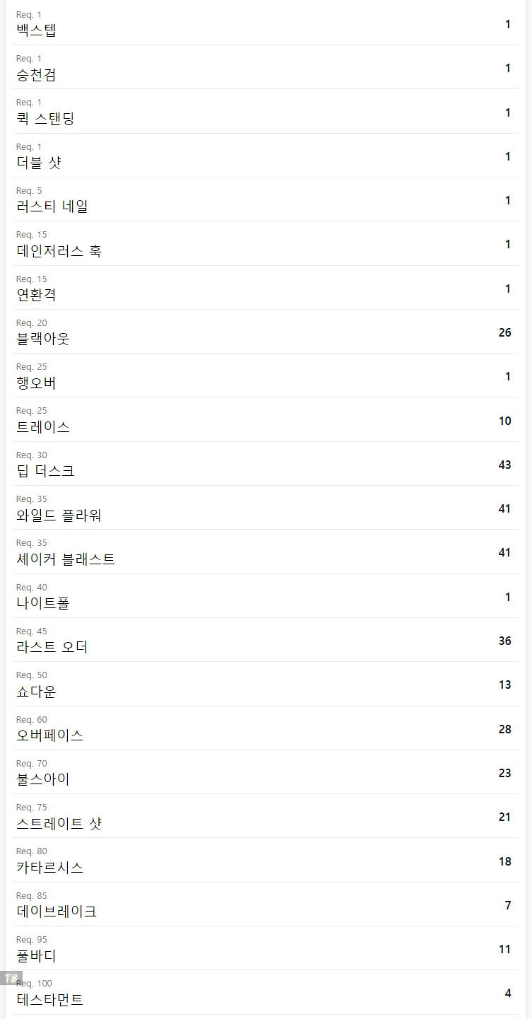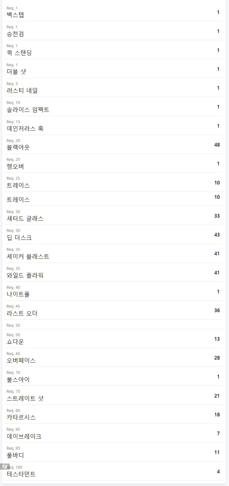 먼저 7월 3일 기준으로 6인의 랭커들 블레이드 스킬트리 액티브 모습입니다. 절반 이상이 나이트폴 스킬을 1개만 찍었습니다. 그리고 불스아이 스킬도 1개씩 찍은 모습도 보입니다. 이 두 가지를 제외하고는 다른 전직 스킬은 거의 다 마스터한 거 같습니다. 저도 이와 비슷하게 스킬을 찍었습니다. 스킬트리에는 100% 정답은 없다고 생각합니다. 나중에 설명할 탈리스만과 겹치는 모든 스킬을 마스터하고 나머지 스킬은 본인에게 맞는 스타일로 가져가시면 됩니다. 랭커들의 스킬도 약간 다르지만 거의 비슷합니다.