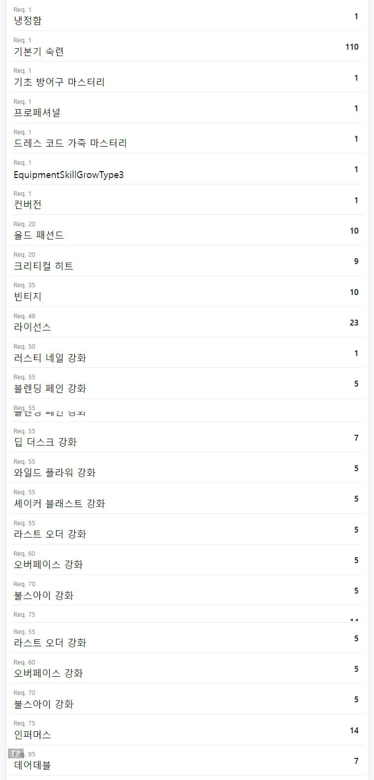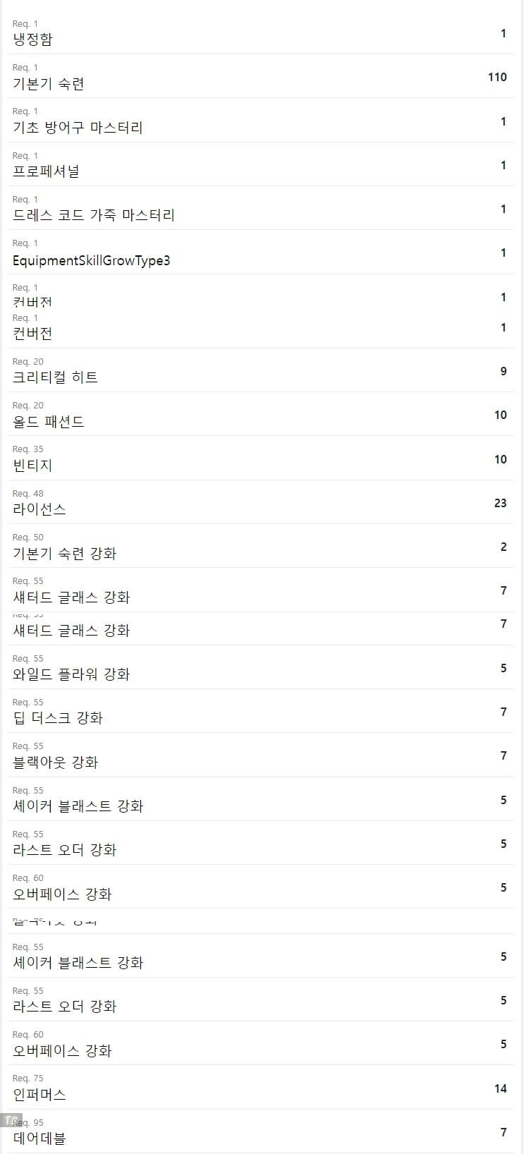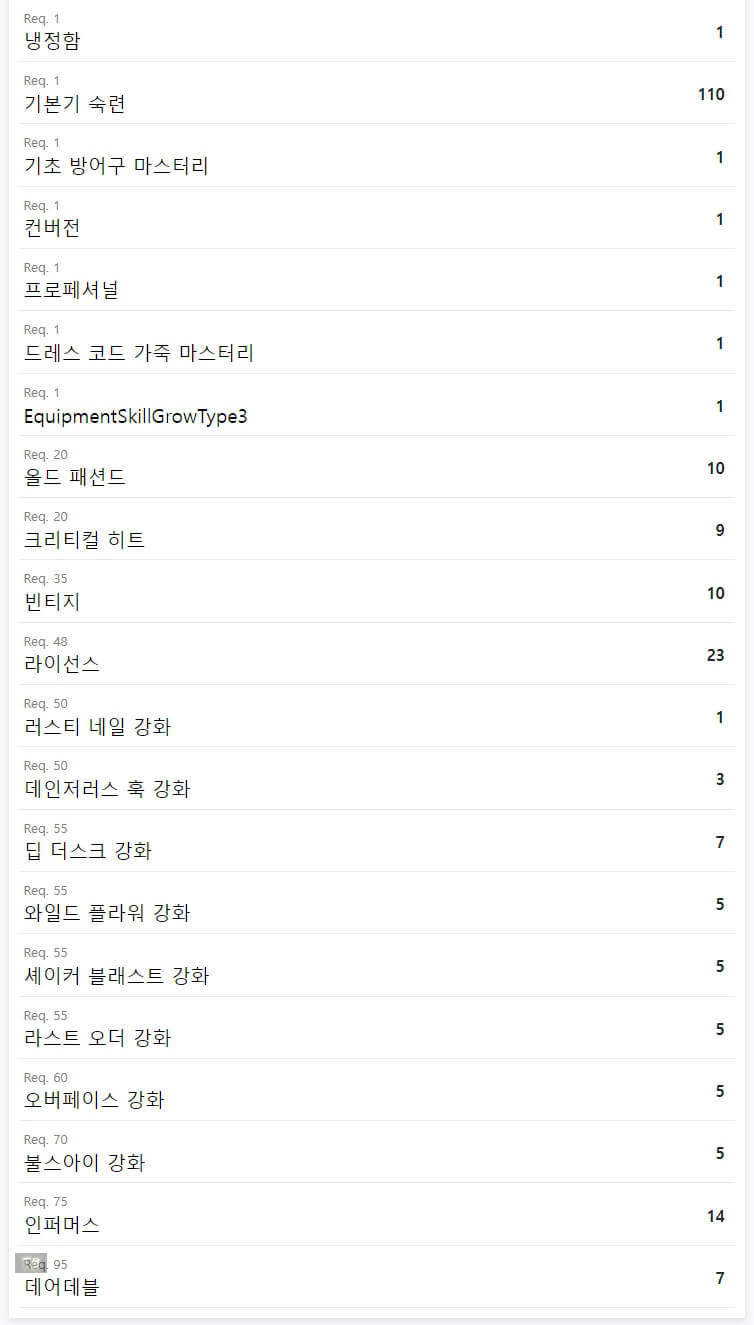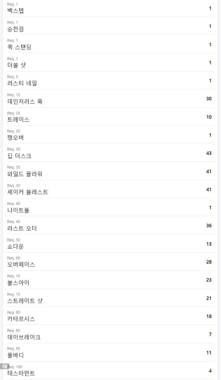 먼저 7월 3일 기준으로 6인의 랭커들 블레이드 스킬트리 액티브 모습입니다. 절반 이상이 나이트폴 스킬을 1개만 찍었습니다. 그리고 불스아이 스킬도 1개씩 찍은 모습도 보입니다. 이 두 가지를 제외하고는 다른 전직 스킬은 거의 다 마스터한 거 같습니다. 저도 이와 비슷하게 스킬을 찍었습니다. 스킬트리에는 100% 정답은 없다고 생각합니다. 나중에 설명할 탈리스만과 겹치는 모든 스킬을 마스터하고 나머지 스킬은 본인에게 맞는 스타일로 가져가시면 됩니다. 랭커들의 스킬도 약간 다르지만 거의 비슷합니다.