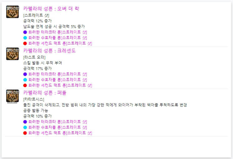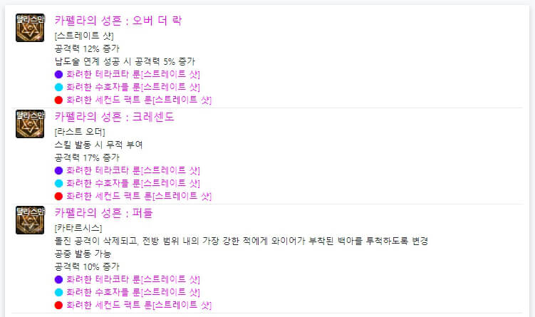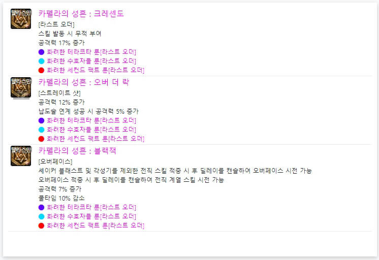 6인의 랭커들의 탈리스만 및 룬입니다. '오버 더 락(스트레이트 샷)', '크레센도(라스터 오더)'는 6인의 랭커가 모두 사용하고 있습니다. 그리고 나머지 한 개는 '퍼들(카타르시스)' 5인, '블랙잭(오버페이스)' 1인이 사용하고 있습니다. 처음에는 탈리스만이 있는 것을 사용하다가 '오버 더 락', '크레센도', '퍼들', ;블랙잭'으로 사용하면 될 거 같습니다. 그리고 탈리스만을 본 후에는 액티브 스킬트리에서 반드시 마스터해야 되는 4가지 스킬이 정해졌습니다. '스트레이트 샷, 라스터 오더, 카타르시스, 오버페이스'는 반드시 마스터하는 것이 좋을 것 같습니다. 그리고 룬은 랭커 5인은 스트레이트 샷을 선택하고 1인은 라스트 오더를 선택하였습니다. 사실 랭커들은 하나의 스킬에 대해서만 룬을 선택합니다. 하지만 막 시작하는 분들이나 평범한 분들은 색상에 따라 룬을 사용하시면 됩니다. 저의 탈리스만을 보시면 룬은 색상에 맞게 다양한 스킬을 유니크 룬으로 사용하고 있습니다. 이것으로 던파 블레이드 스킬트리 및 탈리스만에 대한 설명을 마칩니다. 다음 시간에는 던파 블레이드 에픽 105제 아이템에 대해 알아보겠습니다. 긴 글 읽어주셔서, 감사합니다.