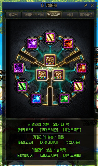마지막으로 이제 탈리스만입니다. 저의 블레이드 탈리스만 모습입니다. 중간에 3개의 탈리스만이 있으며, 1개의 탈리스만당 3개의 룬을 넣을 수 있습니다. 탈리스만과 룬은 내 정보창(M)에서 확인이 할 수 있습니다. 탈리스만은 전체 공격력을 증가시키는 것이 아니라, 관련 스킬의 공격력을 증가시킵니다.