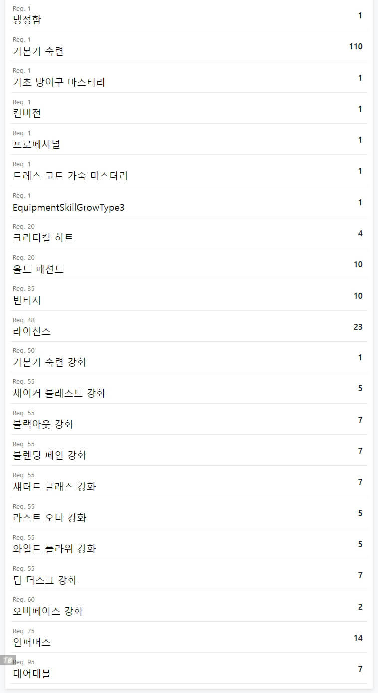 던파 블레이드 스킬트리 패시브 모습입니다. 패시브 스킬은 액티브 스킬을 강화하는 것으로 생각할 수 있습니다. 즉, 액티브 스킬을 먼저 찍고 패시브 스킬을 찍으면 됩니다. 예를 들어, 액티브 스킬에서 불스아이를 1개만 찍었다면 패시브 스킬에서 불스아이 강화를 찍지 않고 다른 강화 스킬에 사용하면 됩니다. 그리고 크리티컬 히트는 10개가 마스터이지만 모두 다릅니다. 크리티컬 히트는 100%가 안 되는 수치만큼만 찍어주면 됩니다. 예를 들어, 모든 장비를 착용한 상태에서 물리 크리티컬이 100% 이상이라면 물리 크리티컬 패시브 스킬에 사용할 필요가 없습니다. 이 경우에는 다른 강화 스킬을 사용하면 됩니다.