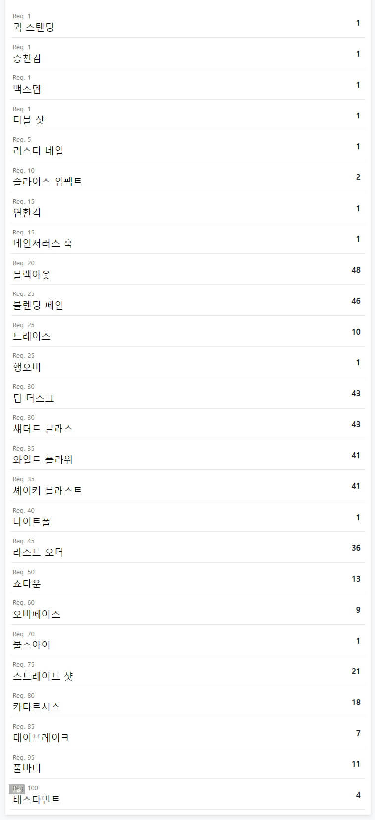 먼저 7월 3일 기준으로 6인의 랭커들 블레이드 스킬트리 액티브 모습입니다. 절반 이상이 나이트폴 스킬을 1개만 찍었습니다. 그리고 불스아이 스킬도 1개씩 찍은 모습도 보입니다. 이 두 가지를 제외하고는 다른 전직 스킬은 거의 다 마스터한 거 같습니다. 저도 이와 비슷하게 스킬을 찍었습니다. 스킬트리에는 100% 정답은 없다고 생각합니다. 나중에 설명할 탈리스만과 겹치는 모든 스킬을 마스터하고 나머지 스킬은 본인에게 맞는 스타일로 가져가시면 됩니다. 랭커들의 스킬도 약간 다르지만 거의 비슷합니다.