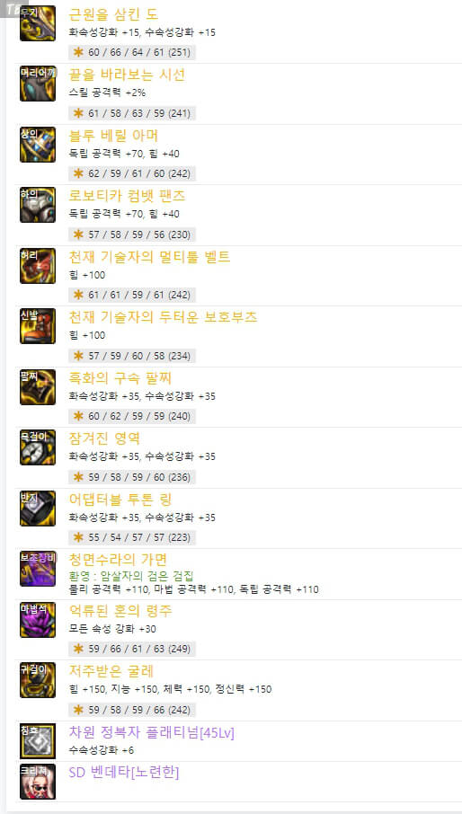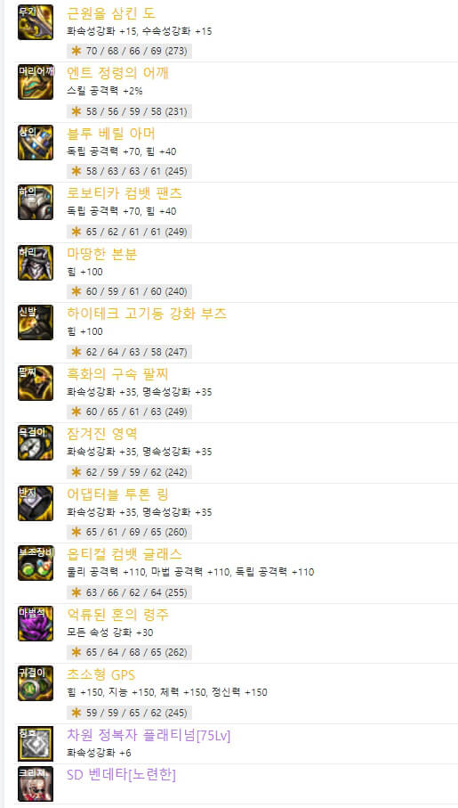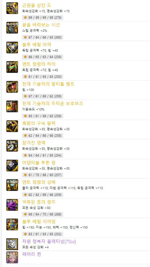 직업별 무기는 위와 같이 '결전의 도 - 블레이드'와 '근원을 삼킨 도' 두 가지 종류의 무기가 존재합니다. 하나는 직업 이름이 붙은 결전 무기이고 다른 하나는 근원 무기입니다. 위와 같이 결전 무기는 자신의 직업만 사용할 수 있으며, 근원을 삼킨 도는 도를 사용하는 직업은 모두 사용할 수 있습니다. 보통 랭커들마다 다르지만, 이번에는 6명의 플레이어 전원이 '근원을 삼킨 도'를 블레이드 무기로 사용하고 있습니다. 현재로서는 던파 블레이드는 결전 무기보다 근원 무기가 더 효율적인 것 같습니다. 이제 장비 아이템을 보면 일단 마법석에 보면 '억류된 혼의 령주'를 많이 사용하고 있습니다. 사실 여유가 된다면 추천하지만 저와 같은 평범한 사람이라면 추천하지 않습니다. '억류된 혼의 령주'는 들고 있는 크리쳐 수에 따라 피해 증가 옵션이 있습니다. 그래서 돈이 많은 분들에게만 추천합니다. 그리고 여기 랭커들은 사용하지 않지만 하의에도 비슷한 아이템이 있습니다. '옥화의 망령 대퇴갑' 이라는 하의 장비 아이템입니다. 아바타 개수에 따라 피해 증가 옵션이 있는 아이템입니다. 처음에는 많이 사용한 거 같았는데, 다행히 지금은 대체품이 나와 있어서 많이 사용하지는 않는 것 같습니다. 5명은 칭호 스킬 레벨 75를 선택했고 1명은 45를 선택했습니다. 사실 위와 같이 모든 아이템을 모으려면 시간이 많이 걸릴 것 같습니다. 따라서 105제 아이템을 아무거나 먼저 착용하는 것이 중요합니다. 그 이유는 100제 아이템은 모험가 명성을 많이 올려주지 않기 때문입니다. 모든 신규 던전에는 모험가 명성 커트라인이 있습니다. 모험가 명성 커트라인을 넘지 않으면 던전에 입장할 수 없습니다. 그래서 각 부위별로 가장 먼저 등장하는 105제 장비 아이템 11개를 변경하는 것이 중요합니다. 그다음에는 랭커 아이템을 하나씩 선택하는 방향으로 가시면 될 것 같습니다.