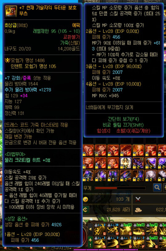안녕하세요. 지난 시간에는 던파 블레이드 아바타 정옵, 휘장, 스킬 트리, 탈리스만에 대해 말씀드렸습니다. 이제 던파 블레이드 마지막 부분인 105제 아이템에 대해 알아보도록 하겠습니다. 사실 레벨이 110으로 해제되고 105 레벨 아이템이 새로 생겨서, 지금 하고 하는 전략이 이전에 하던 전략보다 더 중요한 것 같습니다. 100 레벨의 아이템은 더 이상 필요하지 않으며, 새로운 아이템을 수집하는 것으로 생각할 수 있습니다. 그렇다고 해서 새로 시작하는 직업들은 상관이 없지만 100제 아이템을 상점에 팔거나 장비 해체기로 모두 분해해서는 안됩니다. 그 이유는 105 레벨 아이템들은 성장이라는 시스템이 있습니다. 그래도 100 레벨 아이템을 열심히 모으셨던 분들을 위해, 100 레벨 아이템들 중에 시로코 융합과 연옥 변환(변환 옵션) 최대치인 아이템을 성장 아이템으로 사용할 수 있습니다. 그리고 오즈마 융합 아이템들도 성장 아이템으로 사용할 수 있습니다. 따라서 보통 시로코 융합 부위인 '하의, 보조장비, 반지, 무기'와 오즈마 융합 부위인 '어깨, 벨트, 신발, 목걸이, 마법석'은 성장 아이템으로 사용할 수 있습니다. 여기서 중요한 점은 성장 아이템으로 사용하면 아이템이 사라지기 때문에, 마법부여나 강화, 증폭이 된 경우 '장비 새김'을 사용하여 마법부여, 강화, 증폭을 먼저 이전하고 성장 아이템으로 사용하면 됩니다.