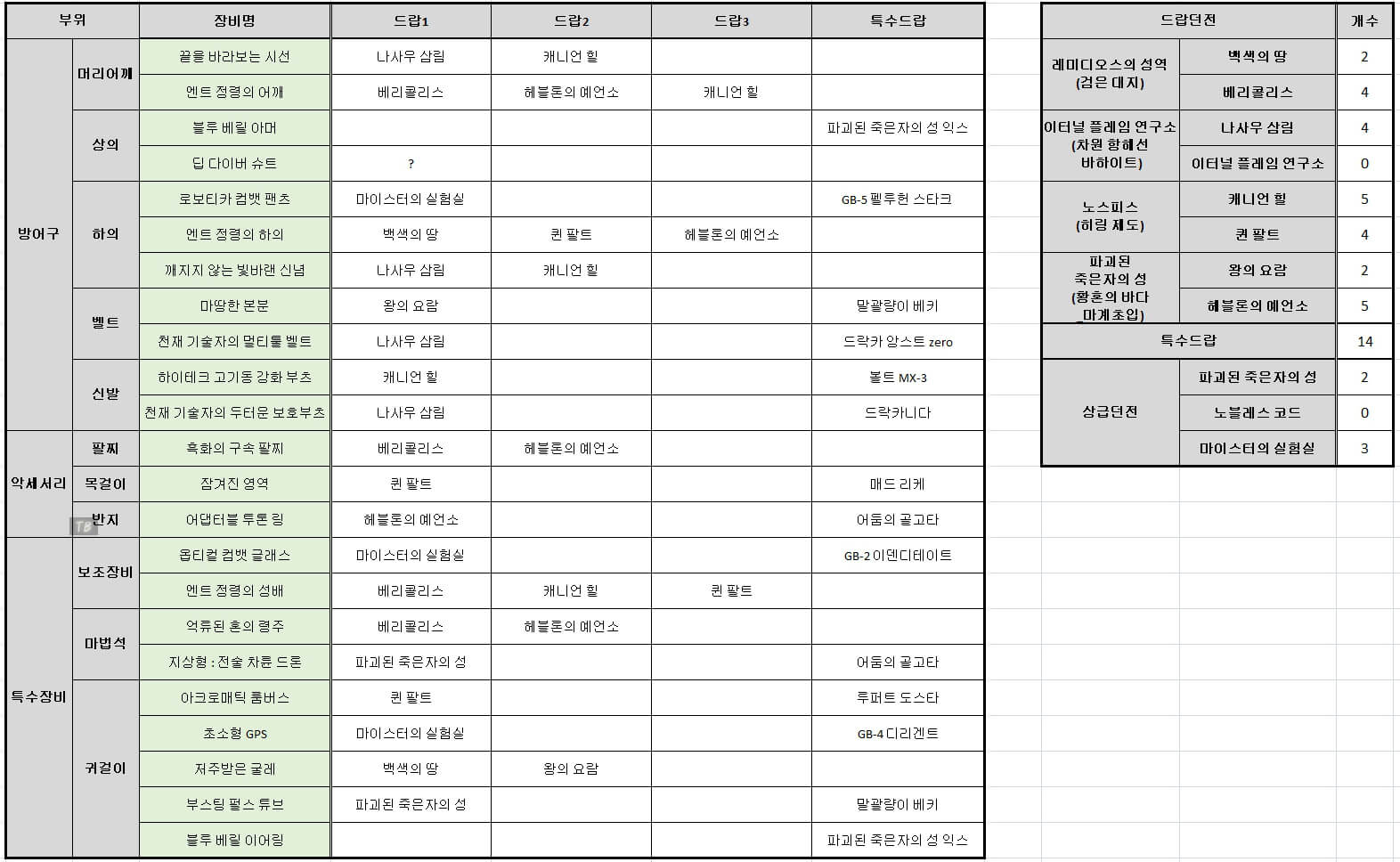 랭커 6인 기준으로 블레이드 에픽 105제 던전 위치입니다. 아이템마다 등장하는 던전의 위치가 다릅니다. 따라서 필요한 아이템을 확인하신 후, 해당 아이템에 맞는 던전에 입장하시면 좋을 것 같습니다. 상의 부분에 '딥 다이버 슈트'는 '마이스터의 실험실' 익스퍼트 난이도 이상에서 나옵니다.