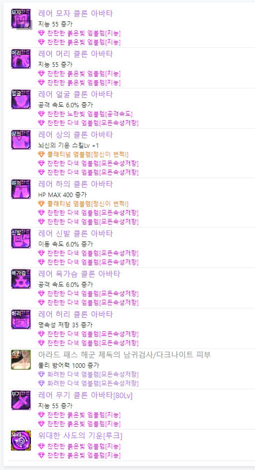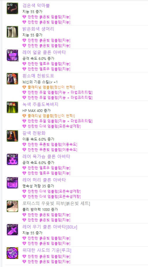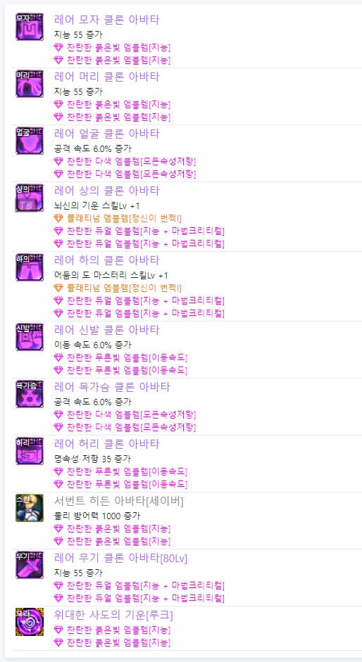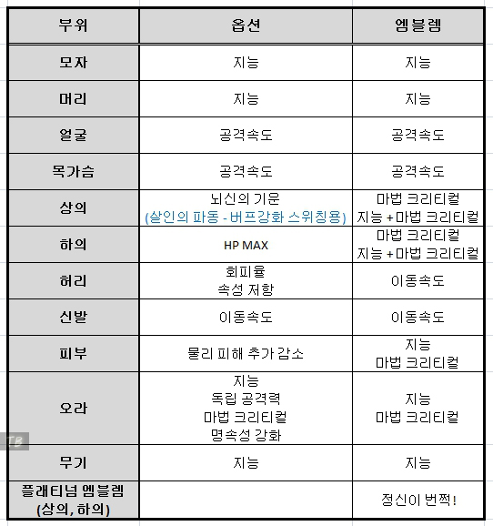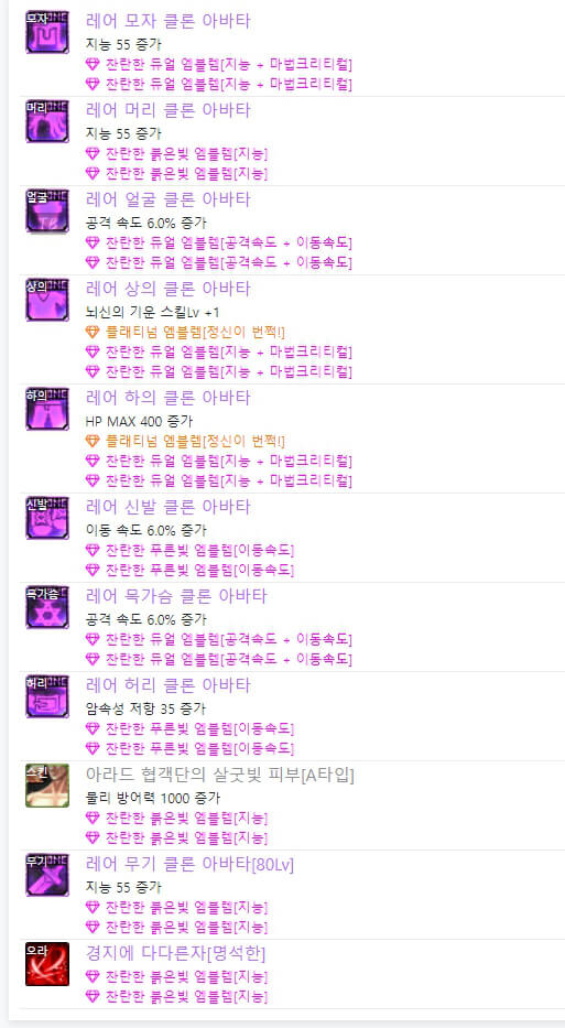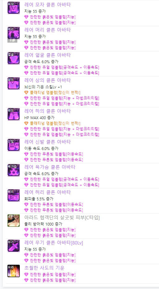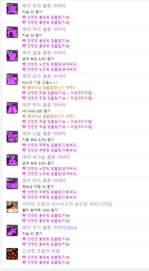 위는 던파 아수라 아바타 정옵 모습입니다. 레어 클론 아바타 또는 이벤트 아바타를 사용 시, 아바타 선택 옵션은 동일합니다. 차이점은 이벤트 아바타를 사용 시, 위와 같이 별로 투자하지 않는 느낌으로 엠블렘을 선택할 수 있다는 점입니다. 하지만 보통 랭커들은 레어 클론 아바타를 착용하고 엠블렘도 약간씩 다릅니다. 아수라는 마법 공격이므로 지능과 마법 크리티컬 기반으로 엠블렘을 선택할 수 있습니다.