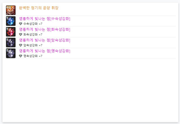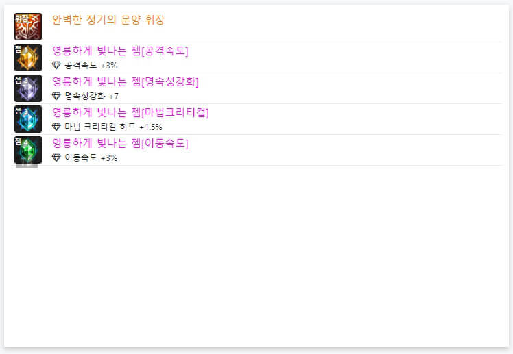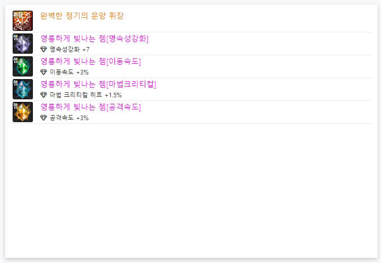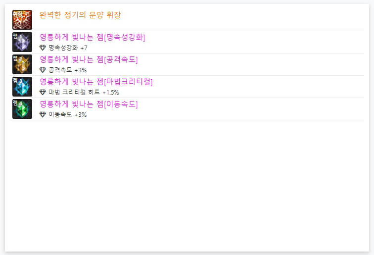 던파 OFF에서 7월 27일 기준으로 랭커 6명의 휘장과 젬 모습입니다. 위에서 언급했듯이, 휘장은 모두 '완벽한 정가의 문양 휘장'을 사용하고 있습니다. 즉, 휘장은 직업별로 100% 동일합니다. 그리고 휘장 아래에 있는 보석처럼 생긴 4개가 '젬'이라고 합니다. 젬은 약간식 다르게 사용됩니다. 보통 딜러들은 '공격 속도, 이동 속도, 속성 강화, 크리티컬'을 많이 사용하는 경향이 있습니다. 던파 아수라는 거의 '명 속성'으로 정해져 있어서, '공격 속도, 이동 속도, 명 속성 강화, 마법 크리티컬'을 많이 사용하고 있습니다. 마법 크리티컬에 100% 이상이면 다른 속성 강화나 캐스트 속도를 사용해도 좋을 거 같습니다.
