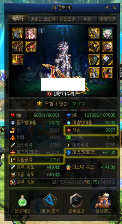 던전앤파이터에는 휘장이라는 시스템이 있습니다. 휘장을 통해, 전반적인 공격력을 높일 수 있습니다. 단, 휘장 획득 조건이 있습니다. 바로 길드에 가입하는 것입니다. 길드를 가입하고 활동을 하면 '길드 주화'를 얻을 수 있습니다. 이 '길드 주화'로 휘장을 구매할 수 있습니다. 그리고 중요한 포인트가 하나 있습니다. 휘장은 직업별로 자신의 직업에 맞는 휘장을 구매해야 합니다. 왼쪽을 보시면 저의 던파 아수라 '내 정보(M)'창입니다. '지능, 독립 공격, 마법 크리티컬'에 밝게 켜져 있는 것을 볼 수 있습니다. 즉, 아수라는 이 세 가지와 관련된 직업이라고 볼 수 있습니다. 따라서 휘장도 '독립 공격력 30, 지능 48'을 증가시키는 '완벽한 정가의 문양 휘장'을 선택하면 됩니다. 직업별 휘장 선택 방법이 더 궁금하시다면 아래 사진을 클릭하시면 확인하실 수 있습니다.