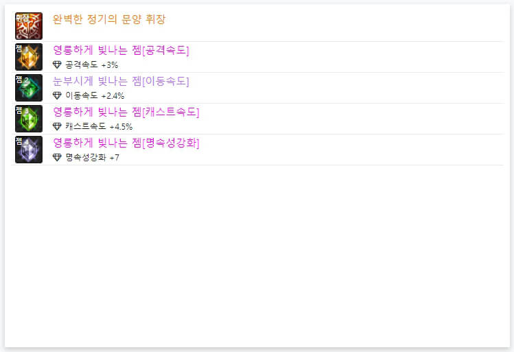 던파 OFF에서 7월 27일 기준으로 랭커 6명의 휘장과 젬 모습입니다. 위에서 언급했듯이, 휘장은 모두 '완벽한 정가의 문양 휘장'을 사용하고 있습니다. 즉, 휘장은 직업별로 100% 동일합니다. 그리고 휘장 아래에 있는 보석처럼 생긴 4개가 '젬'이라고 합니다. 젬은 약간식 다르게 사용됩니다. 보통 딜러들은 '공격 속도, 이동 속도, 속성 강화, 크리티컬'을 많이 사용하는 경향이 있습니다. 던파 아수라는 거의 '명 속성'으로 정해져 있어서, '공격 속도, 이동 속도, 명 속성 강화, 마법 크리티컬'을 많이 사용하고 있습니다. 마법 크리티컬에 100% 이상이면 다른 속성 강화나 캐스트 속도를 사용해도 좋을 거 같습니다.