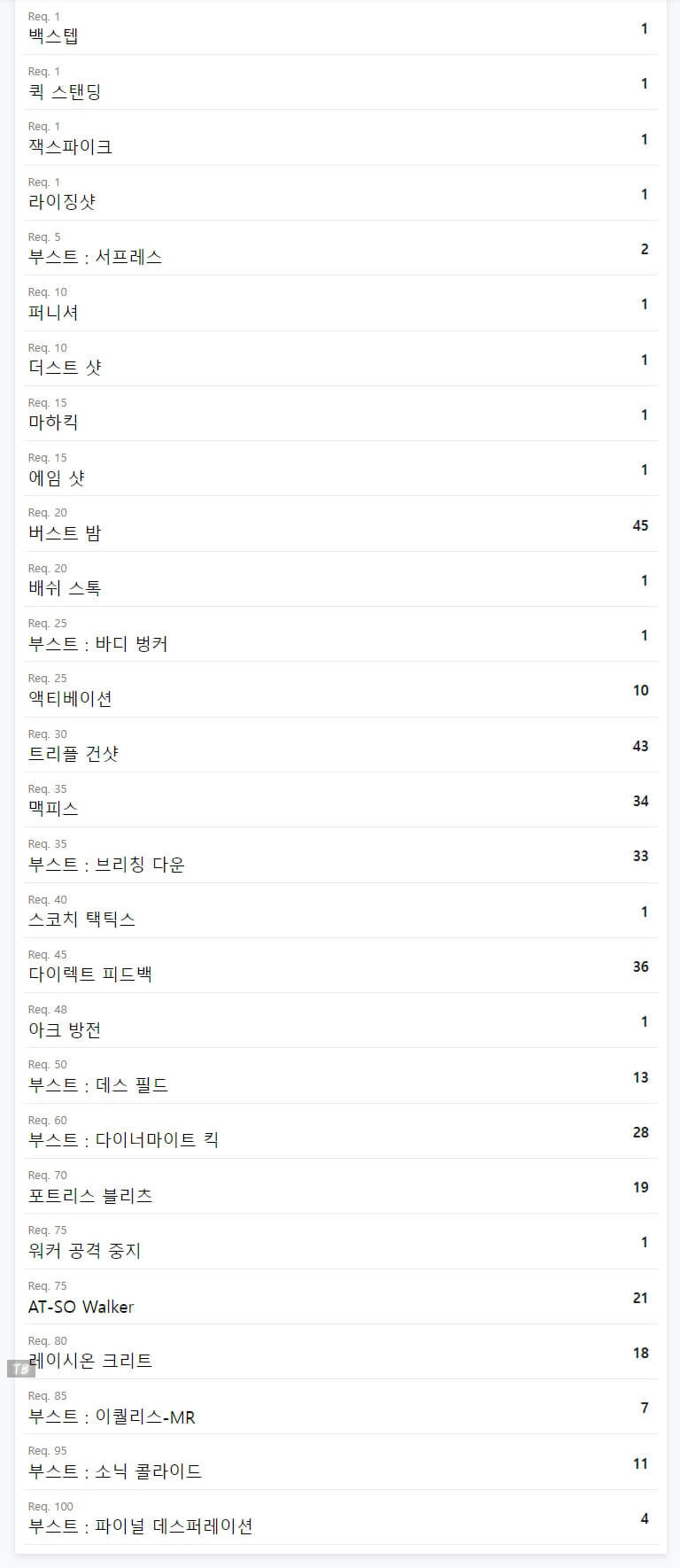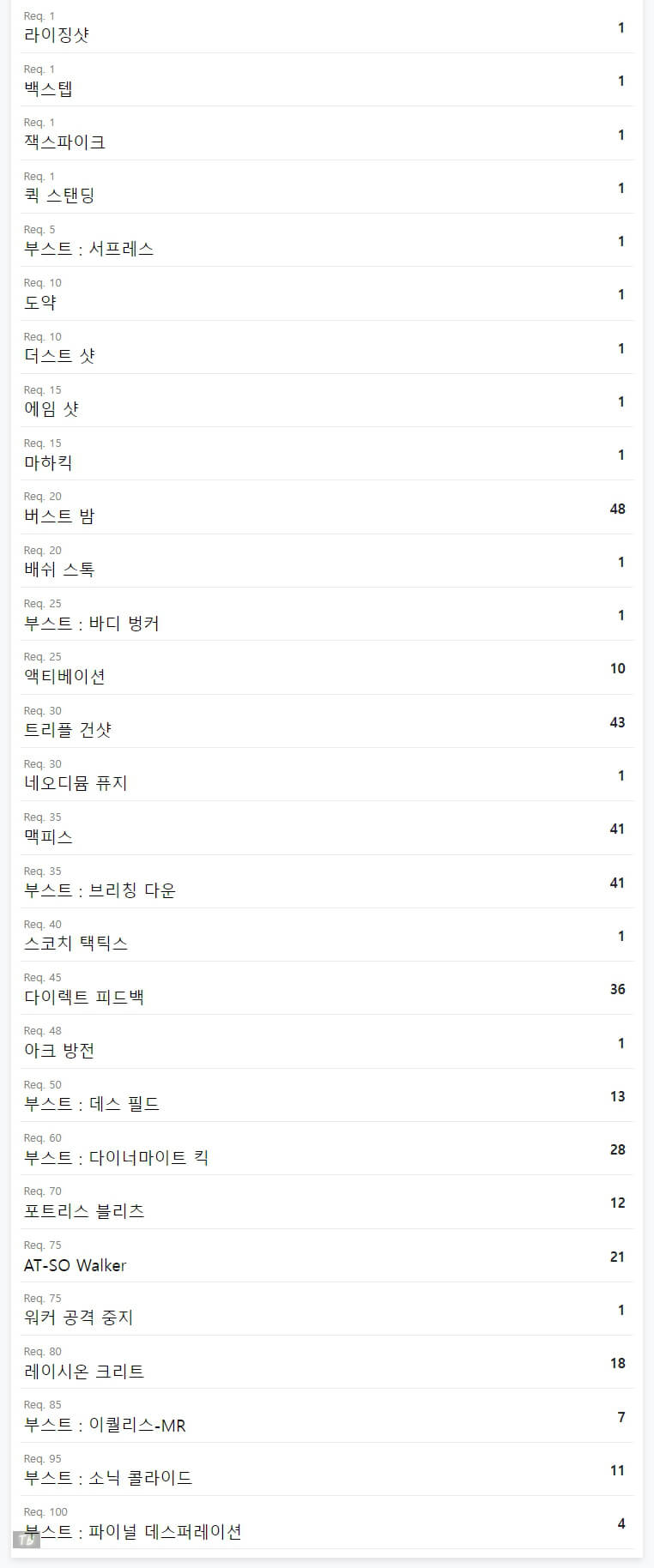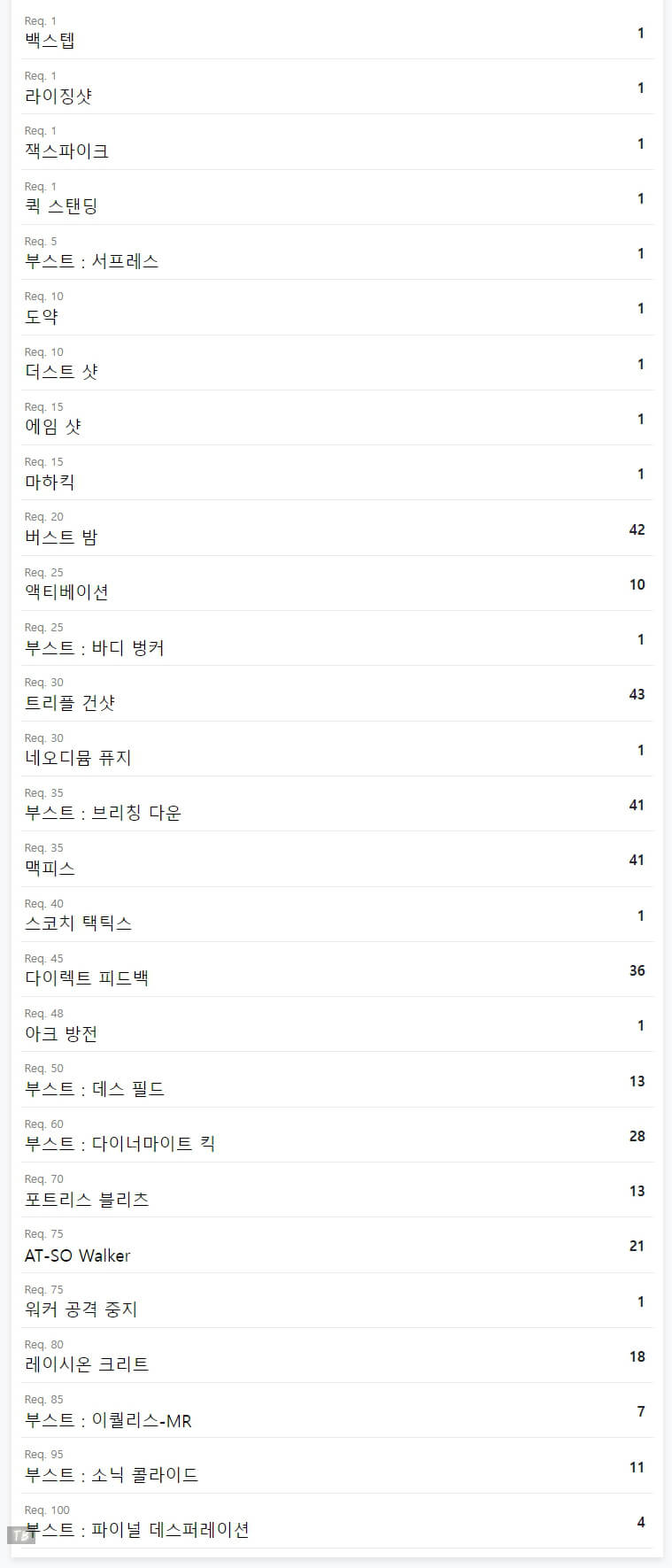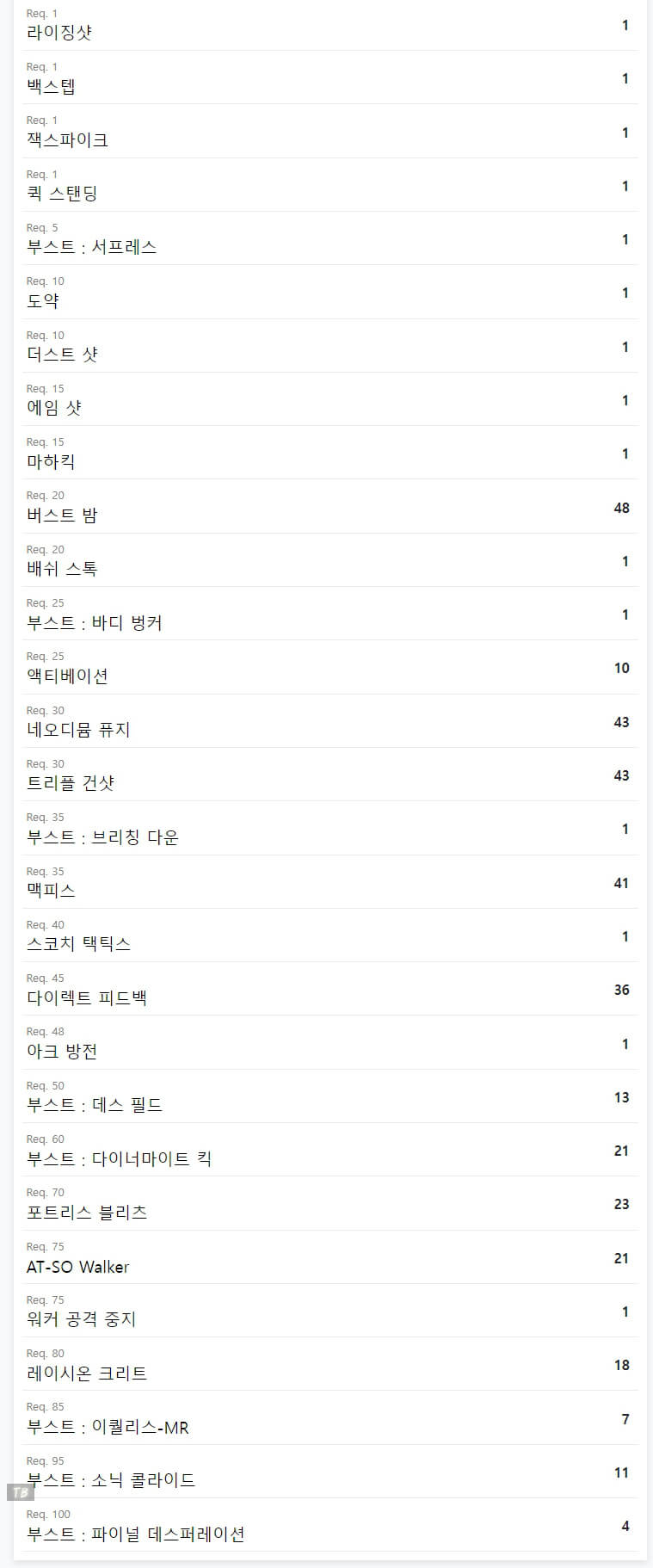 던파 OFF에서 7월 22일 기준으로 랭커 6명의 던파 어썰트 스킬트리 액티브 모습입니다. 랭커 6명의 스킬트리가 거의 비습합니다. 차이점이 있다면 '스코치 택틱스'을 포기하고 전직 기본 스킬인 '버스트 밤'을 선택하느냐, 반대로 '스코치 택틱스'를 선택하고 '버스트 밤'을 1개만 사용하느냐의 챠이라고 보입니다. 6명 중 1명만이 '스코치 택틱스'를 선택했고 나머지 5명은 포기했습니다. 즉, 6명의 랭커들의 선택은 '스코치 택틱스'를 포기하는 하는 것입니다. 스킬은 직접 써보고 결정해야 할 것 같습니다. 나머지 어썰트 스킬트리는 6명의 랭커 모두 거의 동일합니다. 랭커들과 같은 스킬을 선택하시면 될 것 같습니다.