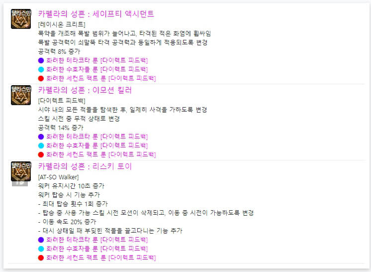 던파 OFF에서 7월 22일 기준으로 랭커 6명의 어썰트 탈리스만 및 룬 모습입니다. 6명의 랭커 사이에는 약간의 차이가 있습니다. 먼저 '다이렉트 피드백(이모션 킬러)'는 6명 모두 공통으로 사용하고 있습니다. 그리고 'AT-SO Walker(리스키 토이)'는 5명이 사용하고 있습니다. 나머지 탈리스만은 '부스트 : 다이너마이트 킥(패트리어트 킥)', '레이시온 크리트(세이프티 액시던트)', '포트리스 블리츠(앱솔루트 포트리스)', '스코치 택틱스(스테이블 택틱스)' 순으로 많이 사용하고 있습니다. 그래서 보통 '다이렉트 피드백(이모션 킬러)', 'AT-SO Walker(리스키 토이)'를 선택하고 나머지 하나는 위에 4개 중에서 선택하는 것 같습니다. 이제 룬을 보면 4명이 '다이렉트 피드백'을 선택하고, 2명이 'AT-SO Walker'를 선택했습니다. 저번에 설명한 무기 레어 아바타 레벨 선택 시, 여기 룬 스킬에 따라 선택하면 됩니다. 그리고 룬 색깔은 일반적으로 빨강, 보라, 파랑으로 많이 선택합니다. 위와 같이 6명의 랭커가 모두 스킬 하나로 통일하여 빨강, 보라, 파랑으로 선택했습니다. 룬은 색깔마다 옵션이 다릅니다. 탈리스만 룬 색깔의 옵션에 대해 자세히 알아보려면 아래 그림을 클릭하세요. 지금까지 던파 어썰트 스킬트리 및 탈리스만에 대해 알아보았습니다. 긴 글 읽어 주셔서, 감사합니다.