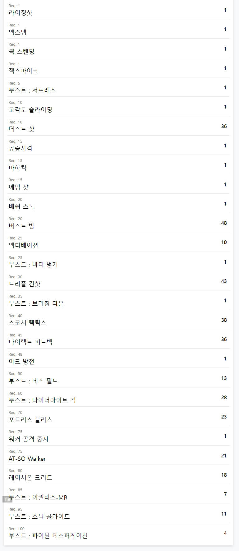 던파 OFF에서 7월 22일 기준으로 랭커 6명의 던파 어썰트 스킬트리 액티브 모습입니다. 랭커 6명의 스킬트리가 거의 비습합니다. 차이점이 있다면 '스코치 택틱스'을 포기하고 전직 기본 스킬인 '버스트 밤'을 선택하느냐, 반대로 '스코치 택틱스'를 선택하고 '버스트 밤'을 1개만 사용하느냐의 챠이라고 보입니다. 6명 중 1명만이 '스코치 택틱스'를 선택했고 나머지 5명은 포기했습니다. 즉, 6명의 랭커들의 선택은 '스코치 택틱스'를 포기하는 하는 것입니다. 스킬은 직접 써보고 결정해야 할 것 같습니다. 나머지 어썰트 스킬트리는 6명의 랭커 모두 거의 동일합니다. 랭커들과 같은 스킬을 선택하시면 될 것 같습니다.