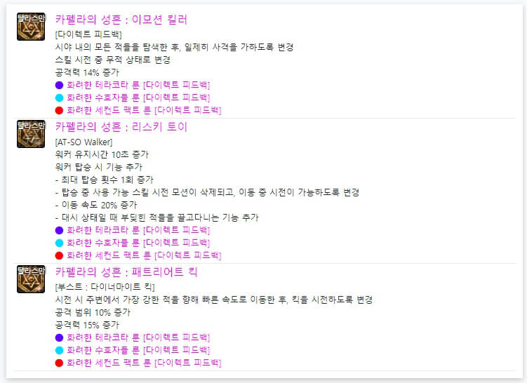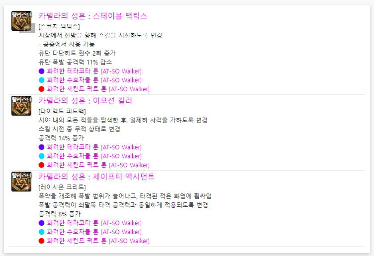 던파 OFF에서 7월 22일 기준으로 랭커 6명의 어썰트 탈리스만 및 룬 모습입니다. 6명의 랭커 사이에는 약간의 차이가 있습니다. 먼저 '다이렉트 피드백(이모션 킬러)'는 6명 모두 공통으로 사용하고 있습니다. 그리고 'AT-SO Walker(리스키 토이)'는 5명이 사용하고 있습니다. 나머지 탈리스만은 '부스트 : 다이너마이트 킥(패트리어트 킥)', '레이시온 크리트(세이프티 액시던트)', '포트리스 블리츠(앱솔루트 포트리스)', '스코치 택틱스(스테이블 택틱스)' 순으로 많이 사용하고 있습니다. 그래서 보통 '다이렉트 피드백(이모션 킬러)', 'AT-SO Walker(리스키 토이)'를 선택하고 나머지 하나는 위에 4개 중에서 선택하는 것 같습니다. 이제 룬을 보면 4명이 '다이렉트 피드백'을 선택하고, 2명이 'AT-SO Walker'를 선택했습니다. 저번에 설명한 무기 레어 아바타 레벨 선택 시, 여기 룬 스킬에 따라 선택하면 됩니다. 그리고 룬 색깔은 일반적으로 빨강, 보라, 파랑으로 많이 선택합니다. 위와 같이 6명의 랭커가 모두 스킬 하나로 통일하여 빨강, 보라, 파랑으로 선택했습니다. 룬은 색깔마다 옵션이 다릅니다. 탈리스만 룬 색깔의 옵션에 대해 자세히 알아보려면 아래 그림을 클릭하세요. 지금까지 던파 어썰트 스킬트리 및 탈리스만에 대해 알아보았습니다. 긴 글 읽어 주셔서, 감사합니다.