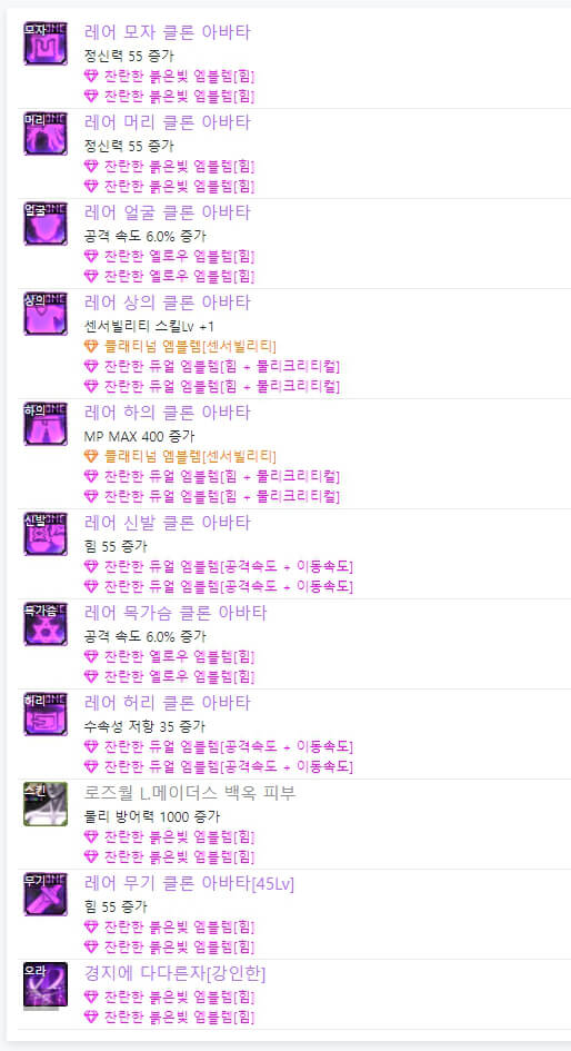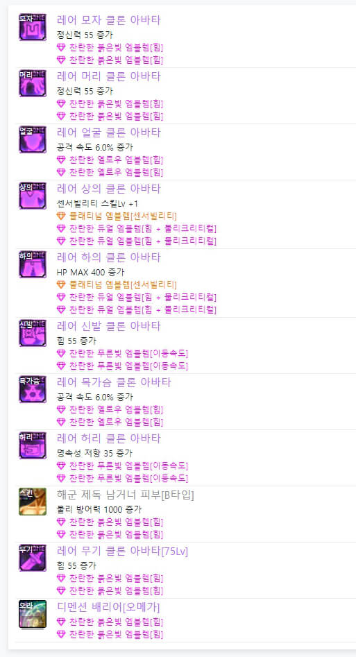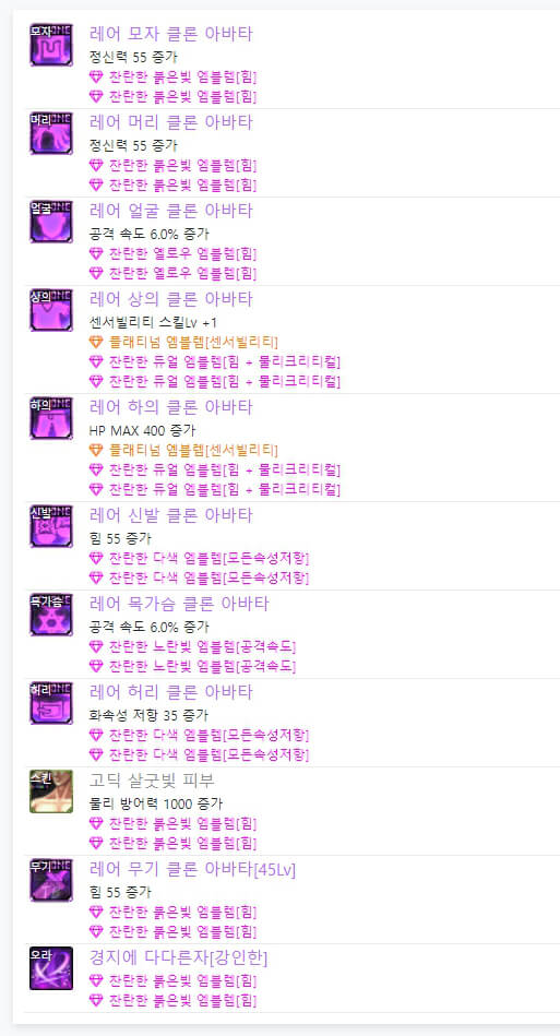 던파 OFF에서 7월 22일 기준으로 랭커 6명의 아바타입니다. 기본적으로 전부 레어 클론 아바타를 입고 있습니다. 보조 캐릭터가 아닌 메인 캐릭터라면 기본적으로 레어 클론 아바타를 사용됩니다. 전체적으로 엠블렘을 볼 때, '힘과 물리 크리티컬'을 주로 선택했습니다. 즉, 엠블렘에 힘과 물리 크리티컬을 선택할 수 있는 곳이라면 힘과 물리 크리티컬을 사용하고 있습니다. 그리고 레어 무기 클론 아바타 레벨은 45를 4인, 75를 2인이 선택하였습니다. 주 스킬에 따라 레어 무기 클론 아바타 레벨을 선택할 수 있습니다. 이것은 다음 시간에 설명할 탈리스만 선택과 관련이 있습니다. 일반적으로 탈리스만 룬 스킬의 레벨과 레어 무기 클론 아바타 레벨과 동일합니다. 그리고 레어 클론 아바타 상의, 하의의 플래티넘 엠블렘은 '센서빌리티'를 사용하고 아바타 상의 선택 옵션도 '센서빌리티'를 선택하였습니다. 마지막으로 버프 강화 스위칭용 상의 아바타 옵션은 버프 스킬인 '액티베이션'을 선택하였습니다.