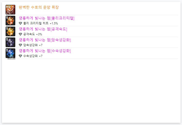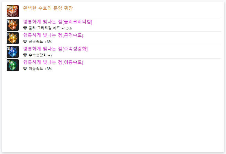 먼저 휘장을 살펴보면 6명 모두 '완벽한 수호의 문양 휘장'을 선택했습니다. 휘장은 직업에 따라 결정되기 때문에, 100% 동일함을 알 수 있습니다. 그리고 휘장 아래에 보석처럼 보이는 것을 '젬'이라고 하며, 휘장 1개당 4개의 젬을 선택할 수 있습니다. 보통 딜러들은 '공격 속도, 이동속도, 크리티컬, 속성 강화'를 많이 사용합니다. 공격 속도가 필요하지 않은 직업이라면 '캐스트 속도'를 사용합니다. 위 6명의 랭커를 보면 공격 속도를 선택하지 않고 2가지 속성 강화를 선택한 랭커도 있습니다. 젬은 꼭 랭커를 따를 필요가 없으며, 캐릭터 속성 강화에 따라 젬을 선택할 수 있습니다.